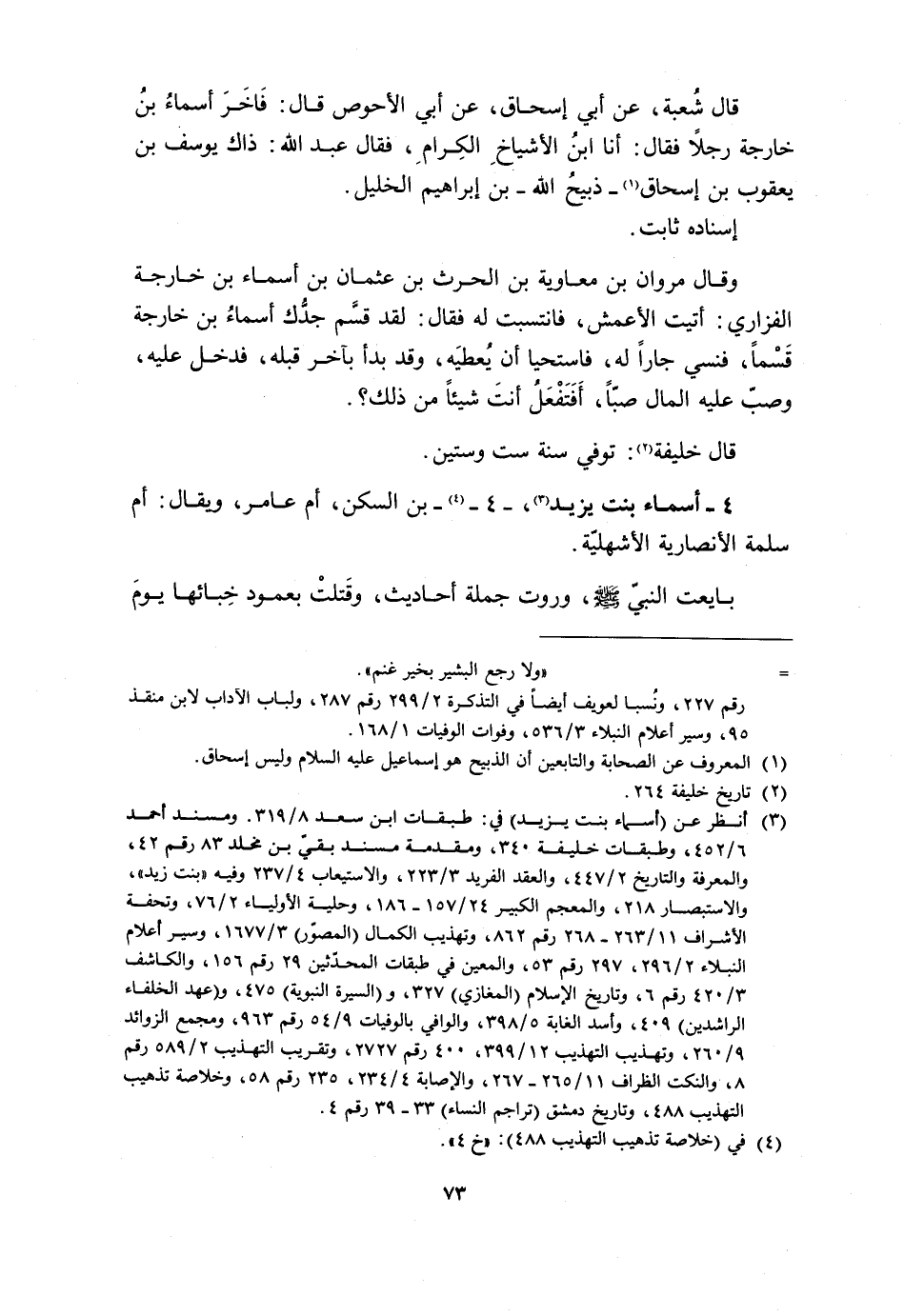 قَالَ شُعْبَةُ، عَنْ أَبِي إِسْحَاقَ، عَنْ أَبِي الْأَحْوَصِ قَالَ: فَاخَرَ أَسْمَاءُ بْنُ خَارِجَةَ رَجُلًا فَقَالَ: أَنَا ابْنُ الْأَشْيَاخِ الْكِرَامِ، فَقَالَ عَبْدُ اللَّهِ: ذَاكَ يُوسُفُ بْنُ يَعْقُوبَ بْنِ إِسْحَاقَ [1]- ذبيح الله- بن إِبْرَاهِيمَ الْخَلِيلِ.