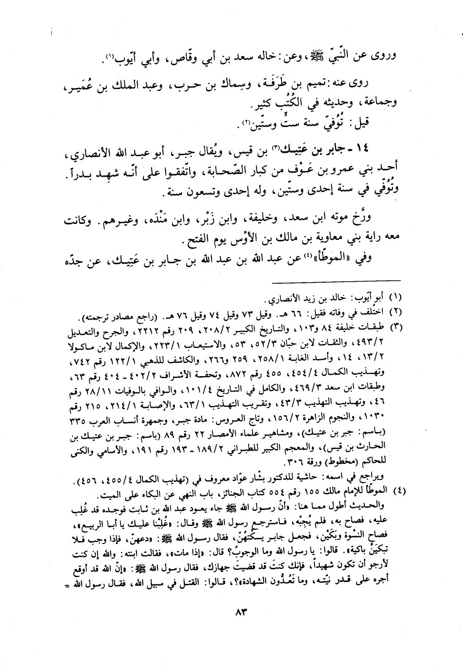 [3] طبقات خليفة 84 و 103، والتاريخ الكبير 2/ 208، 209 رقم 2212، والجرح والتعديل 2/ 493، والثقات لابن حبّان 3/ 52، 53، والاستيعاب 1/ 223، والإكمال لابن ماكولا 2/ 13، 14، وأسد الغابة 1/ 258، 259 و 266، والكاشف للذهبي 1/ 122 رقم 742، وتهذيب الكمال 4/ 454، 455 رقم 872، وتحفة الأشراف 2/ 402- 404 رقم 63، وطبقات ابن سعد 3/ 469، والكامل في التاريخ 4/ 101، والوافي بالوفيات 11/ 28 رقم 46، وتهذيب التهذيب 3/ 43، وتقريب التهذيب 1/ 63، والإصابة 1/ 214، 215 رقم 1030، والنجوم الزاهرة 2/ 156، وتاج العروس: مادة جبر، وجمهرة أنساب العرب 335 (باسم: جبر بن عتيك) ، ومشاهير علماء الأمصار 22 رقم 89 (باسم: جبر بن عتيك بن الحارث بن قيس) ، والمعجم الكبير للطبراني 2/ 189- 193 رقم 191، والأسامي والكنى للحاكم (مخطوط) ورقة 306.