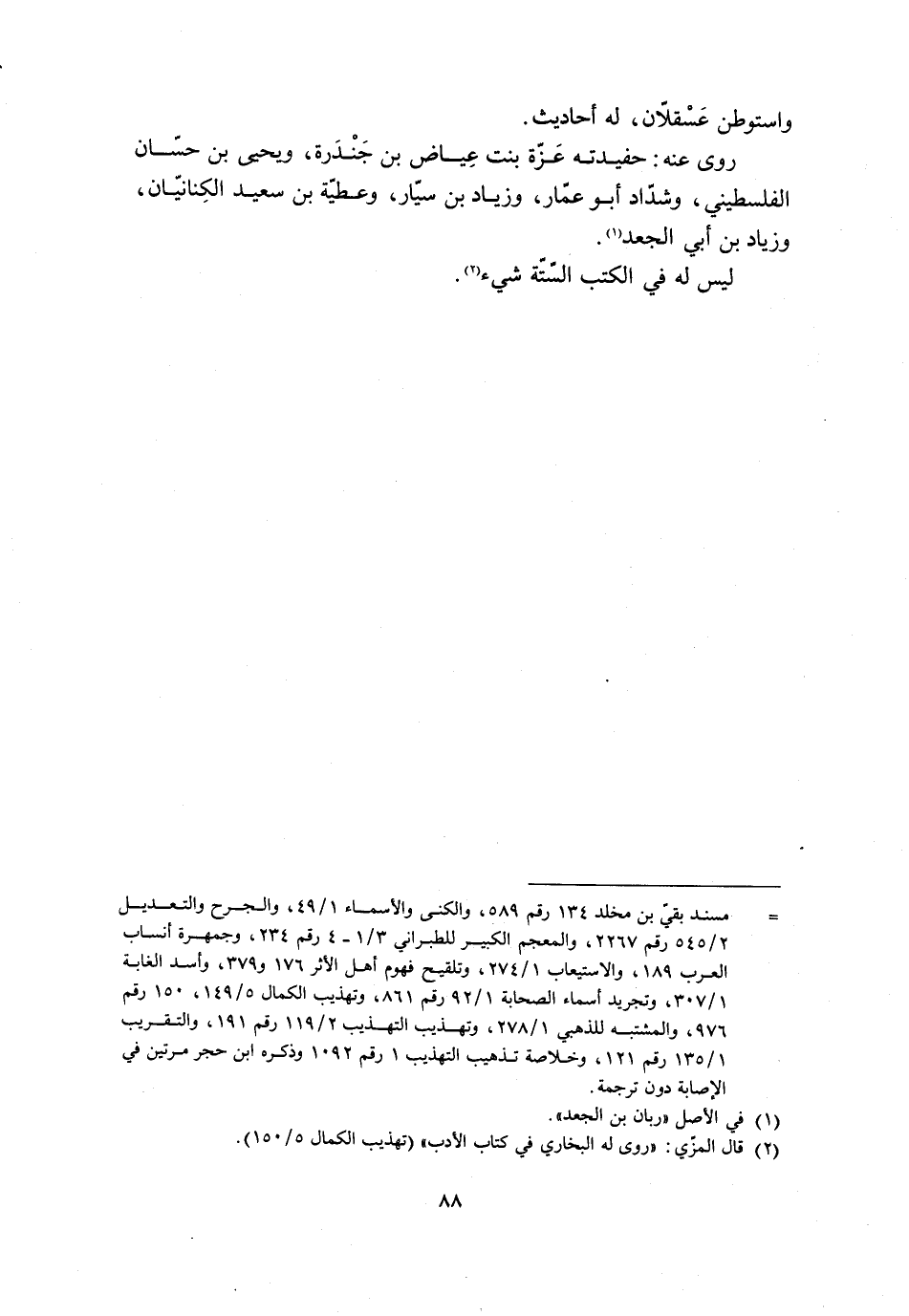 [ () ] مسند بقيّ بن مخلد 134 رقم 589، والكنى والأسماء 1/ 49، والجرح والتعديل 2/ 545 رقم 2267، والمعجم الكبير للطبراني 3/ 1- 4 رقم 234، وجمهرة أنساب العرب 189، والاستيعاب 1/ 274، وتلقيح فهوم أهل الأثر 176 و 379، وأسد الغابة 1/ 307، وتجريد أسماء الصحابة 1/ 92 رقم 861، وتهذيب الكمال 5/ 149، 150 رقم 976، والمشتبه للذهبي 1/ 278، وتهذيب التهذيب 2/ 119 رقم 191، والتقريب 1/ 135 رقم 121، وخلاصة تذهيب التهذيب 1 رقم 1092 وذكره ابن حجر مرتين في الإصابة دون ترجمة.