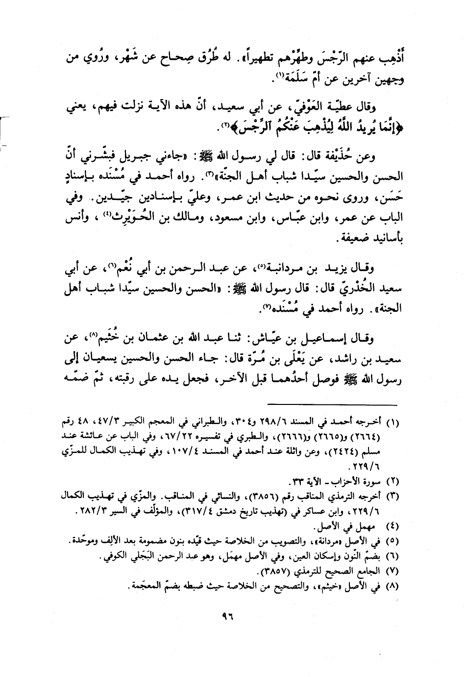 أَذْهِبْ عَنْهُمُ الرِّجْسَ وَطَهِّرْهُمْ تَطْهِيرًا» . لَهُ طُرُقٌ صِحَاحٌ عَنْ شَهْرٍ، وَرُوِيَ مِنْ وَجْهَيْنِ آخَرَيْنِ عَنْ أُمِّ سَلَمَةَ [1] . وَقَالَ عَطِيَّةُ الْعَوْفِيُّ، عَنْ أَبِي سَعِيدٍ، أَنَّ هَذِهِ الآيَةَ نَزَلَتْ فِيهِمْ، يَعْنِي إِنَّما يُرِيدُ اللَّهُ لِيُذْهِبَ عَنْكُمُ الرِّجْسَ 33: 33 [2] .