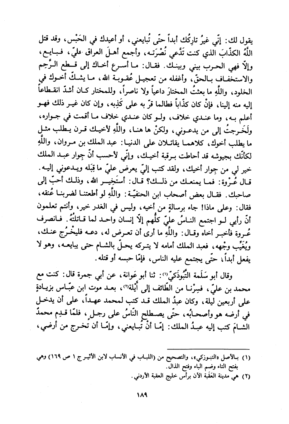 وَقَالَ أَبُو سَلَمَةَ التَّبُوذَكِيُّ [1] : ثنا أَبُو عَوَانَةَ، عَنْ أَبِي جَمْرَةَ قَالَ: كُنْتُ مَعَ مُحَمَّدِ بْنِ عَلِيٍّ، فَسِرْنَا مِنَ الطَّائِفِ إِلَى أَيْلَةَ [2] ، بَعْدَ مَوْتِ ابْنِ عَبَّاسٍ بِزِيَادَةٍ عَلَى أَرْبَعِينَ لَيْلَةً، وَكَانَ عَبْدُ الْمَلِكِ قَدْ كَتَبَ لِمُحَمَّدٍ عَهْدًا، عَلَى أَنْ يَدْخُلَ فِي أَرْضِهِ هُوَ وَأَصْحَابُهُ، حَتَّى يَصْطَلِحَ النَّاسُ عَلَى رَجُلٍ، فَلَمَّا قَدِمَ مُحَمَّدٌ الشَّامَ كَتَبَ إِلَيْهِ عَبْدُ الْمَلِكِ: إِمَّا أَنْ تبايعني، وإمّا أن تخرج من أرضي،