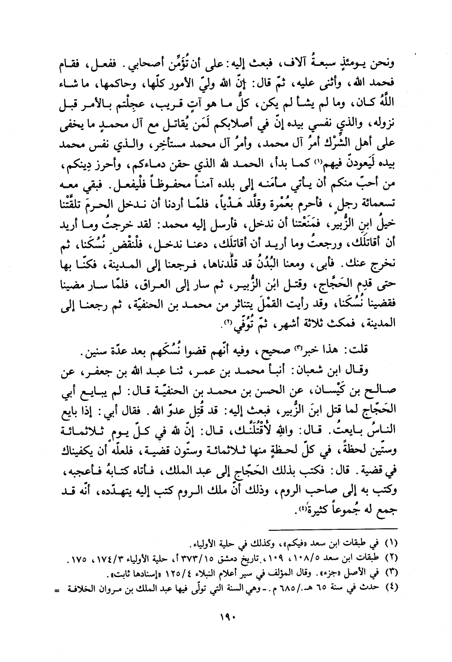 وَنَحْنُ يَوْمَئِذٍ سَبْعَةُ آلافٍ، فَبَعَثَ إِلَيْهِ: عَلَى أَنْ تُؤَمِّنَ أَصْحَابِي. فَفَعَلَ، فَقَامَ فَحَمَدَ اللَّهَ، وَأَثْنَى عَلَيْهِ، ثُمَّ قَالَ: إِنَّ اللَّهَ وَلِيُّ الأُمُورِ كُلِّهَا، وَحَاكِمُهَا، مَا شَاءَ اللَّهُ كَانَ، وَمَا لَمْ يَشَأْ لَمْ يَكُنْ، كُلُّ مَا هُوَ آتٍ قَرِيبٌ، عَجِلْتُمْ بِالأَمْرِ قَبْلَ نُزُولِهِ، وَالَّذِي نَفْسِي بِيَدِهِ إِنَّ فِي أَصْلابِكُمْ لَمَنْ يُقَاتِلُ مَعَ آلِ مُحَمَّدٍ مَا يَخْفَى عَلَى أَهْلَ الشِّرْكِ أَمْرُ آلِ مُحَمَّدٍ، وَأَمْرُ آلِ مُحَمَّدٍ مُسْتَأْخِرٌ، وَالَّذِي نَفْسُ مُحَمَّدٍ بِيَدِهِ لَيَعُودُنَّ فِيهِمْ [1] كَمَا بَدَأَ، الْحَمْدُ للَّه الَّذِي حَقَنَ دِمَاءَكُمْ، وَأَحْرَزَ دِينَكُمْ، مَنْ أَحَبَّ مِنْكُمْ أَنْ يَأْتِيَ مَأْمَنَهُ إِلَى بَلَدِهِ آمِنًا مَحْفُوظًا فَلْيَفْعَلْ. فَبَقِيَ مَعَهُ تِسْعُمِائَةِ رَجُلٍ، فَأَحْرَمَ بِعُمْرَةٍ وَقَلَّدَ هَدْيًا، فَلَمَّا أَرَدْنَا أَنْ نَدْخُلَ الْحَرَمَ تَلَقَّتْنَا خَيْلُ ابْنِ الزُّبَيْرِ، فَمَنَعَتْنَا أَنْ نَدْخُلَ، فَأَرْسَلَ إِلَيْهِ مُحَمَّدٌ: لَقَدْ خَرَجْتُ وَمَا أُرِيدُ أَنْ أُقَاتِلَكَ، وَرَجَعْتُ وَمَا أُرِيدُ أَنْ أُقَاتِلَكَ، دَعْنَا نَدْخُلُ، فَلْنَقْضِ نُسُكَنَا، ثُمَّ نَخْرُجُ عَنْكَ. فَأَبَى، وَمَعَنَا الْبُدْنُ قَدْ قَلَّدْنَاهَا، فَرَجَعْنَا إِلَى الْمَدِينَةِ، فَكُنَّا بِهَا حَتَّى قَدِمَ الْحَجَّاجُ، وَقَتَلَ ابْنَ الزُّبَيْرِ، ثُمَّ سَارَ إِلَى الْعِرَاقَ، فَلَمَّا سَارَ مَضَيْنَا فَقَضَيْنَا نُسُكَنَا، وَقَدْ رَأَيْتُ الْقَمْلَ يَتَنَاثَرُ مِنْ مُحَمَّدِ بْنِ الْحَنَفِيَّةِ، ثُمَّ رَجَعْنَا إِلَى الْمَدِينَةِ، فَمَكَثَ ثَلاثَةَ أَشْهُرٍ، ثُمَّ تُوُفِّيَ [2] .