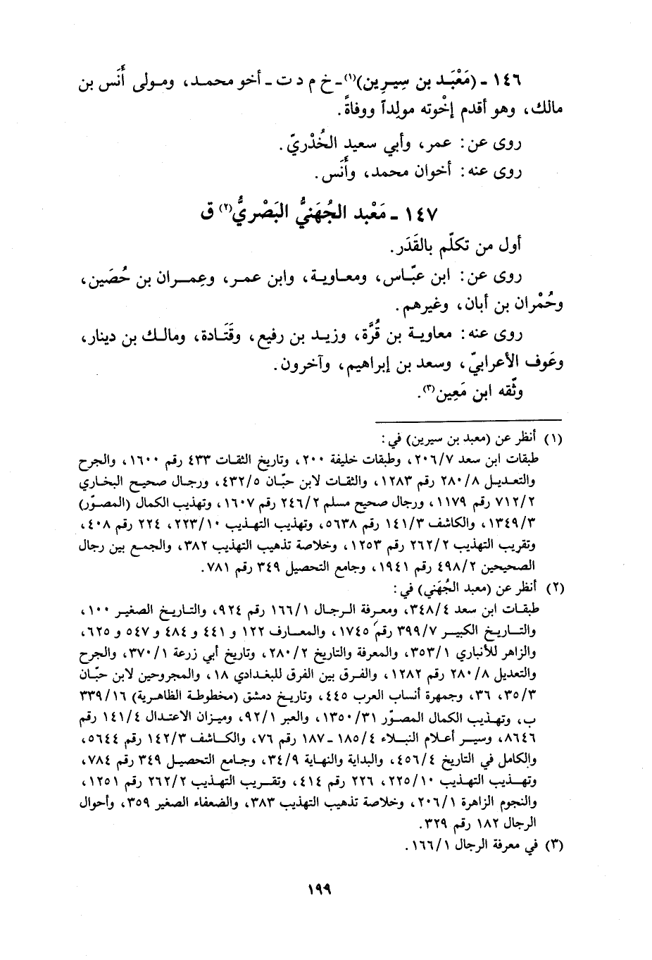 147- مَعْبَدٌ الْجُهَنِيُّ الْبَصْرِيُّ [2] ق أَوَّلُ مَنْ تَكَلَّمَ بِالْقَدَرِ.