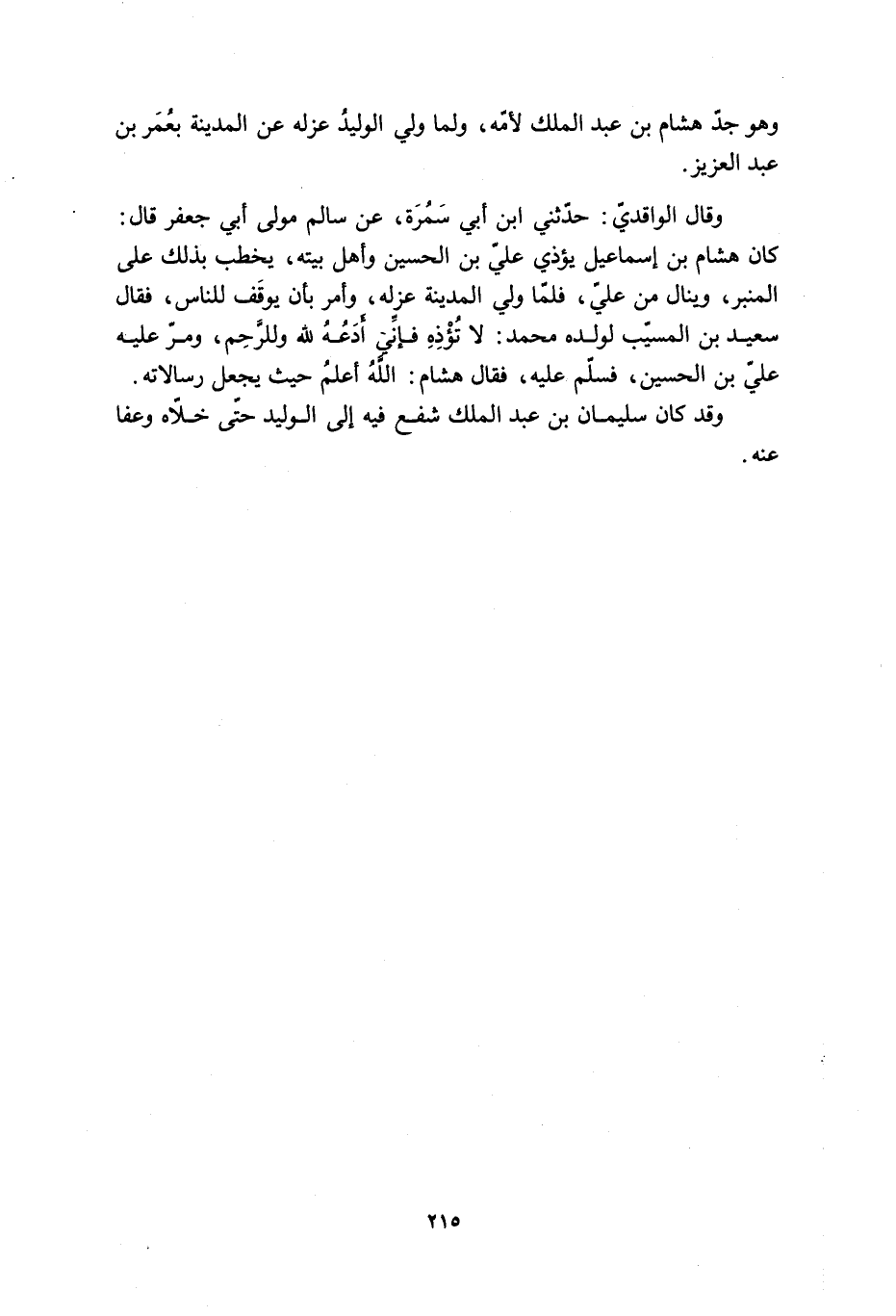 كان هشام بن إسماعيل يؤذي عليّ بْنَ الْحُسَيْنِ وَأَهْلَ بَيْتِهِ، يَخْطُبُ بِذَلِكَ عَلَى الْمِنْبَرِ، وَيَنَالُ مِنْ عَلِيٍّ، فَلَمَّا وَلِيَ الْمَدِينَةَ عَزَلَهُ، وَأَمَرَ بِأَنْ يُوقَفَ لِلنَّاسِ، فَقَالَ سَعِيدُ بْنُ الْمُسَيِّبِ لِوَلَدِهِ مُحَمَّدٍ: لا تُؤْذِهِ فَإِنِّي أدَعُهُ للَّه وَلِلرَّحِمِ، وَمَرَّ عَلَيْهِ عَلِيُّ بْنُ الْحُسَيْنِ، فَسَلَّمَ عَلَيْهِ، فَقَالَ هِشَامٌ: اللَّهُ أَعْلَمُ حَيْثُ يَجْعَلُ رِسَالاتِهِ.