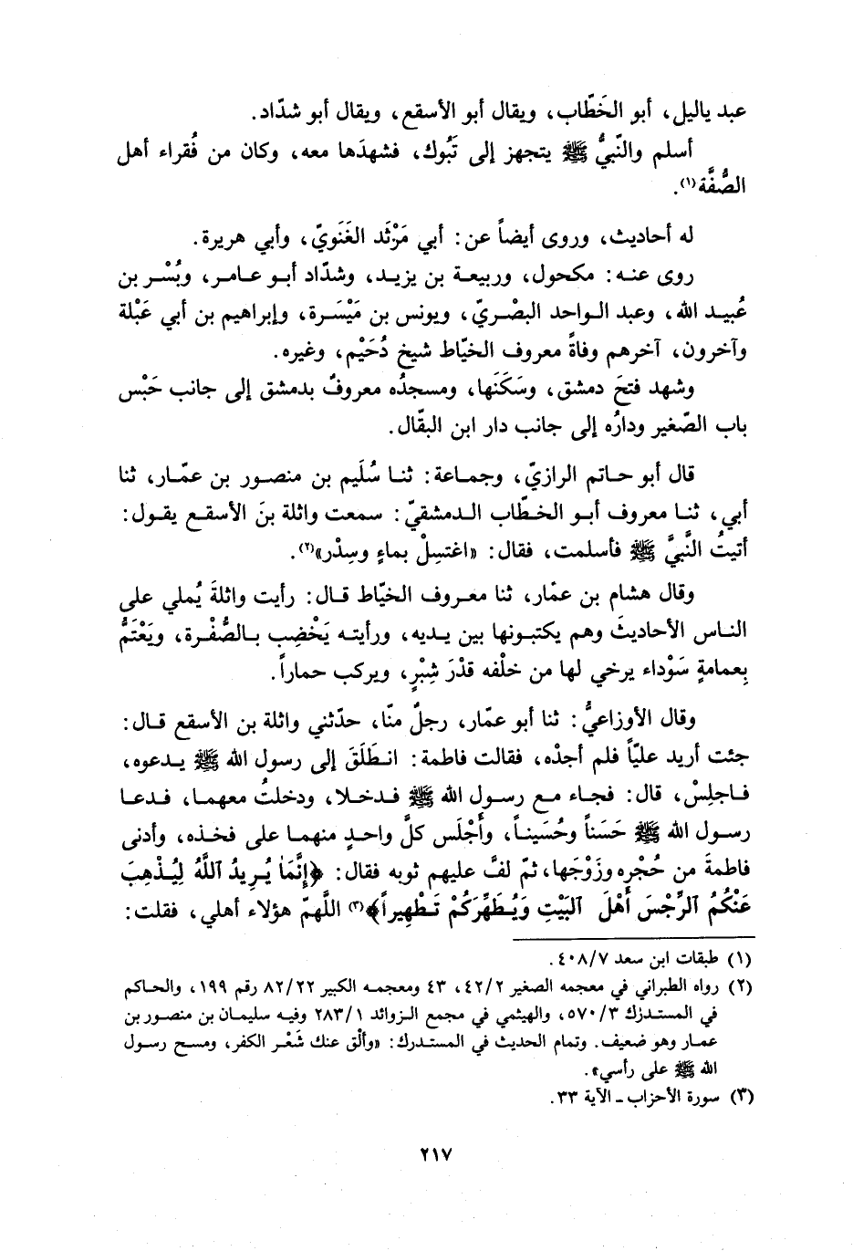 وَقَالَ الأَوْزَاعِيُّ: ثنا أَبُو عَمَّارٍ، رَجُلٌ مِنَّا، حَدَّثَنِي وَاثِلَةُ بْنُ الأَسْقَعِ قَالَ: جِئْتُ أُرِيدُ عَلِيًّا فَلَمْ أَجِدْهُ، فَقَالَتْ فَاطِمَةُ: انْطَلَقَ إِلَى رَسُولِ اللَّهِ صَلَّى اللَّهُ عَلَيْهِ وَسَلَّمَ يَدْعُوهُ، فَاجْلِسْ، قَالَ: فَجَاءَ مَعَ رَسُولِ اللَّهِ صَلَّى اللَّهُ عَلَيْهِ وَسَلَّمَ فَدَخَلا، وَدَخَلْتُ مَعَهُمَا، فَدَعَا رَسُولُ اللَّهِ صَلَّى اللَّهُ عَلَيْهِ وَسَلَّمَ حَسَنًا وَحُسَيْنًا، وَأَجْلَسَ كُلَّ وَاحِدٍ مِنْهُمَا عَلَى فَخْذِهِ، وَأَدْنَى فَاطِمَةَ مِنْ حِجْرِهِ وَزَوْجَهَا، ثُمَّ لَفَّ عَلَيْهِمْ ثَوْبَهُ فَقَالَ: إِنَّما يُرِيدُ اللَّهُ لِيُذْهِبَ عَنْكُمُ الرِّجْسَ أَهْلَ الْبَيْتِ وَيُطَهِّرَكُمْ تَطْهِيراً 33: 33 [3] اللَّهمّ هؤلاء أهلي، فقلت: