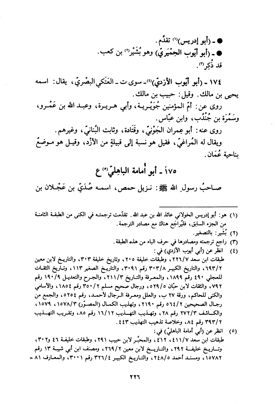 175- أَبُو أُمَامَةَ الْبَاهِلِيُّ [5] ع صَاحِبُ رَسُولِ اللَّهِ صَلَّى اللَّهُ عَلَيْهِ وَسَلَّمَ: نَزِيلُ حمص، اسمه صديّ بن عجلان بن
