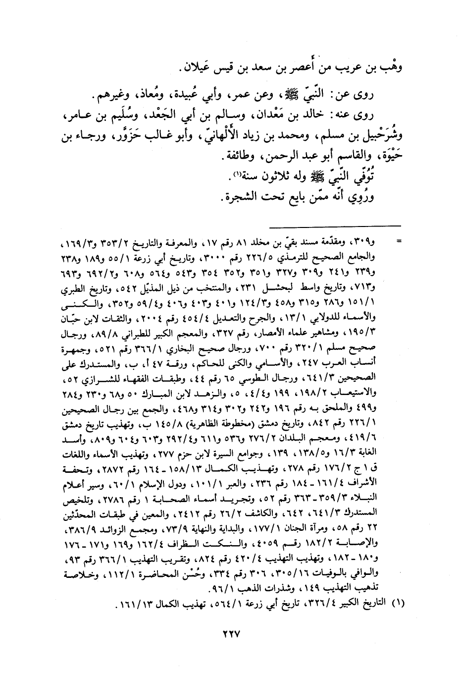 [ () ] و 309، ومقدّمة مسند بقيّ بن مخلد 81 رقم 17، والمعرفة والتاريخ 2/ 353 و 3/ 169، والجامع الصحيح للترمذي 5/ 226 رقم 3000، وتاريخ أبي زرعة 1/ 55 و 189 و 238 و 239 و 241 و 309 و 327 و 351 و 352 و 354 و 543 و 564 و 608 و 2/ 692 و 693 و 713، وتاريخ واسط لبحشل 231، والمنتخب من ذيل المذيّل 542، وتاريخ الطبري 1/ 151 و 286 و 315 و 458 و 3/ 124 و 401 و 403 و 406 و 4/ 59 و 352، والكنى والأسماء للدولابي 1/ 13، والجرح والتعديل 4/ 454 رقم 2004، والثقات لابن حبّان 3/ 195، ومشاهير علماء الأمصار، رقم 327، والمعجم الكبير للطبراني 8/ 89، ورجال صحيح مسلم 1/ 320 رقم 700، ورجال صحيح البخاري 1/ 366 رقم 521، وجمهرة أنساب العرب 247، والأسامي والكنى للحاكم، ورقة 47 أ، ب، والمستدرك على الصحيحين 3/ 641، ورجال الطوسي 65 رقم 44، وطبقات الفقهاء للشيرازي 52، والاستيعاب 2/ 198، 199 و 4/ 4، 5، والزهد لابن المبارك 50 و 68 و 230 و 284 و 499 والملحق به رقم 196 و 242 و 302 و 314 و 468، والجمع بين رجال الصحيحين 1/ 226 رقم 842، وتاريخ دمشق (مخطوطة الظاهرية) 8/ 145 ب، وتهذيب تاريخ دمشق 6/ 419، ومعجم البلدان 2/ 276 و 536 و 611 و 4/ 292 و 603 و 604 و 809، وأسد الغابة 3/ 16 و 5/ 138، 139، وجوامع السيرة لابن حزم 277، وتهذيب الأسماء واللغات ق 1 ج 2/ 176 رقم 278، وتهذيب الكمال 13/ 158- 164 رقم 2872، وتحفة الأشراف 4/ 161- 184 رقم 236، والعبر 1/ 101، ودول الإسلام 1/ 60، وسير أعلام النبلاء 3/ 359- 363 رقم 52، وتجريد أسماء الصحابة 1 رقم 2786، وتلخيص المستدرك 3/ 641، 642، والكاشف 2/ 26 رقم 2412، والمعين في طبقات المحدّثين 22 رقم 58، ومرآة الجنان 1/ 177، والبداية والنهاية 9/ 73، ومجمع الزوائد 9/ 386، والإصابة 2/ 182 رقم 4059، والنكت الظراف 4/ 162 و 169 و 169 و 171- 176 و 180- 182، وتهذيب التهذيب 4/ 420 رقم 824، وتقريب التهذيب 1/ 366 رقم 93، والوافي بالوفيات 16/ 305، 306 رقم 334، وحسن المحاضرة 1/ 112، وخلاصة تذهيب التهذيب 149، وشذرات الذهب 1/ 96.