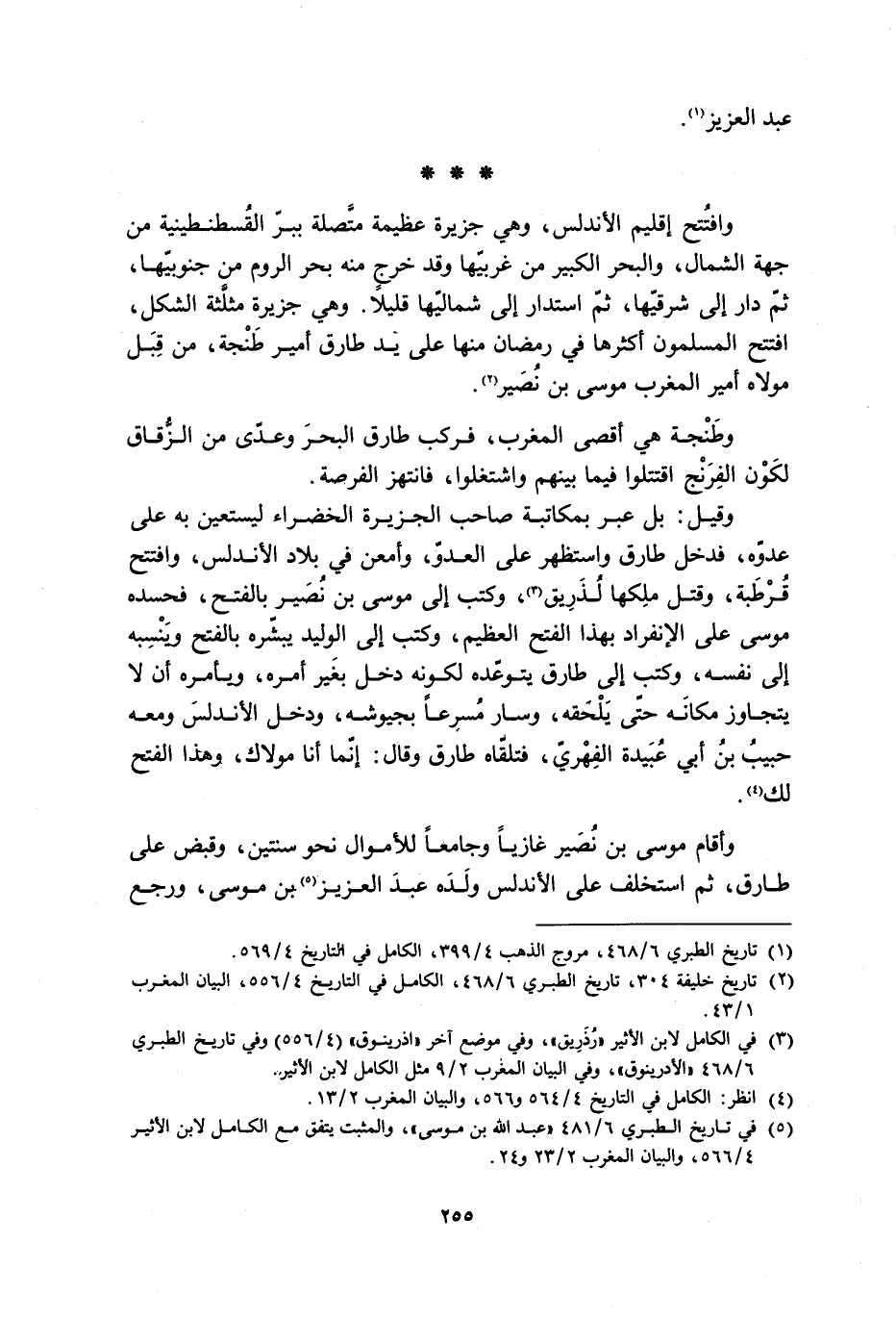 وَأَقَامَ مُوسَى بْنُ نُصَيْرٍ غَازِيًا وَجَامِعًا لِلأَمْوَالِ نَحْوَ سَنَتَيْنِ، وَقَبَضَ عَلَى طَارِقٍ، ثُمَّ اسْتَخْلَفَ عَلَى الأَنْدَلُسِ وَلَدَهُ عَبْدَ الْعَزِيزِ [5] بن موسى، ورجع