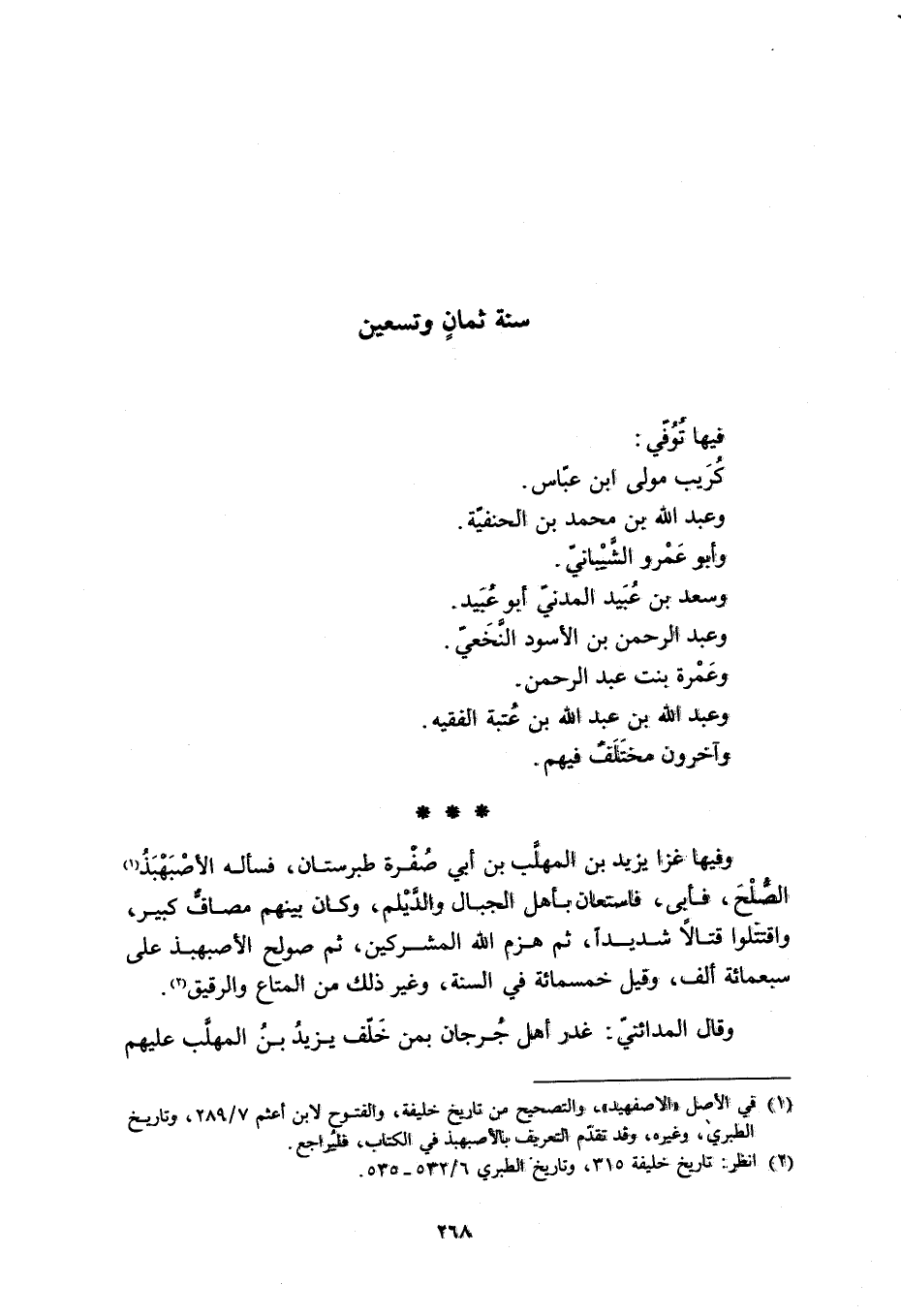 وَفِيهَا غَزَا يَزِيدُ بْنُ الْمُهَلَّبِ بْنِ أَبِي صُفْرَةَ طَبَرِسْتَانَ، فَسَأَلَهُ الأَصْبَهْبَذُ [1] الصُّلْحَ، فَأَبَى، فَاسْتَعَانَ بِأَهْلِ الْجِبَالِ وَالدَّيْلَمِ، وَكَانَ بَيْنَهُمْ مَصَافٌّ كَبِيرٌ، وَاقْتَتَلُوا قِتَالا شَدِيدًا، ثُمَّ هَزَمَ اللَّهُ الْمُشْرِكِينَ، ثُمَّ صُولِحَ الأَصْبَهْبَذُ عَلَى سَبْعِمِائَةِ أَلْفٍ، وَقِيلَ خَمْسِمِائَةٍ فِي السَّنَةِ، وَغَيْرِ ذَلِكَ مِنَ الْمَتَاعِ وَالرَّقِيقِ [2] .
