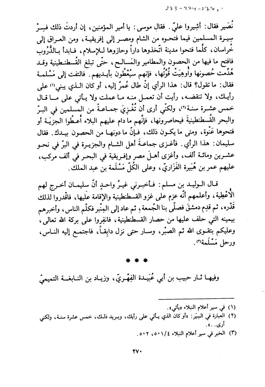 نُصَيْرٍ فَقَالَ: أَشِيرُوا عَلَيَّ. فَقَالَ مُوسَى: يَا أَمِيرَ الْمُؤْمِنِينَ، إِنْ أَرَدْتَ ذَلِكَ فَسِرْ سِيرَةَ الْمُسْلِمِينَ فِيمَا فَتَحُوهُ مِنَ الشَّامِ وَمِصْرَ إِلَى إفريقية، ومن العراق إلى خراسان، كُلَّمَا فَتَحُوا مَدِينَةً اتَّخَذُوهَا دَارًا وَحَازَوْهَا لِلإِسْلامِ، فَابْدَأْ بِالدُّرُوبِ فَافْتَحْ مَا فِيهَا مِنَ الْحُصُونِ وَالْمَطَامِيرِ وَالْمَسَالِحِ، حَتَّى تَبْلُغَ الْقُسْطَنْطِينِيَّةَ وَقَدْ هُدِّمَتْ حُصُونُهَا وَأُوهِيَتْ قُوَّتُهَا، فَإِنَّهُمْ سَيُعْطُونَ بِأَيْدِيهِمْ. فَالْتَفَتَ إِلَى مُسْلِمَةَ فَقَالَ: مَا تَقُولُ؟ قَالَ: هَذَا الرَّأْيُ إِنْ طَالَ عُمْرٌ إِلَيْهِ، أَوْ كَانَ الَّذِي يَبْنِي [1] عَلَى رَأْيِكَ، وَلا تَنْقُضُهُ، رَأَيْتُ أَنْ تَعْمَلَ مِنْهُ مَا عَمِلْتَ وَلا يَأْتِي عَلَى مَا قَالَ خَمْسَ عَشْرَةَ سَنَةً [2] ، وَلَكِنِّي أَرَى أَنْ تغزي جَمَاعَةً مِنَ الْمُسْلِمِينَ فِي الْبَرِّ وَالْبَحْرِ الْقُسْطَنْطِينِيَّةَ فَيُحَاصِرُونَهَا، فَإِنَّهُمْ مَا دَامَ عَلَيْهِمُ الْبَلاءُ أَعْطُوا الْجِزْيَةَ أَوْ فَتَحُوهَا عُنْوَةً، وَمَتَى مَا يَكُونُ ذَلِكَ، فَإِنَّ مَا دُونَهَا مِنَ الْحُصُونِ بِيَدِكَ. فَقَالَ سُلَيْمَانُ: هَذَا الرَّأْيُ. فَأَغْزَى جَمَاعَةَ أَهْلِ الشَّامِ وَالْجَزِيرَةِ فِي الْبَرِّ فِي نَحْوِ عِشْرِينَ وَمِائَةِ أَلْفٍ، وَأَغْزَى أَهْلَ مِصْرَ وَإِفْرِيقِيَّةَ فِي الْبَحْرِ فِي أَلْفِ مَرْكَبٍ، عَلَيْهِمْ عُمَرُ بْنُ هُبَيْرَةَ الْفَزَارِيُّ، وَعَلَى الْكُلِّ مُسْلِمَةُ بْنُ عَبْدِ الْمَلِكِ.