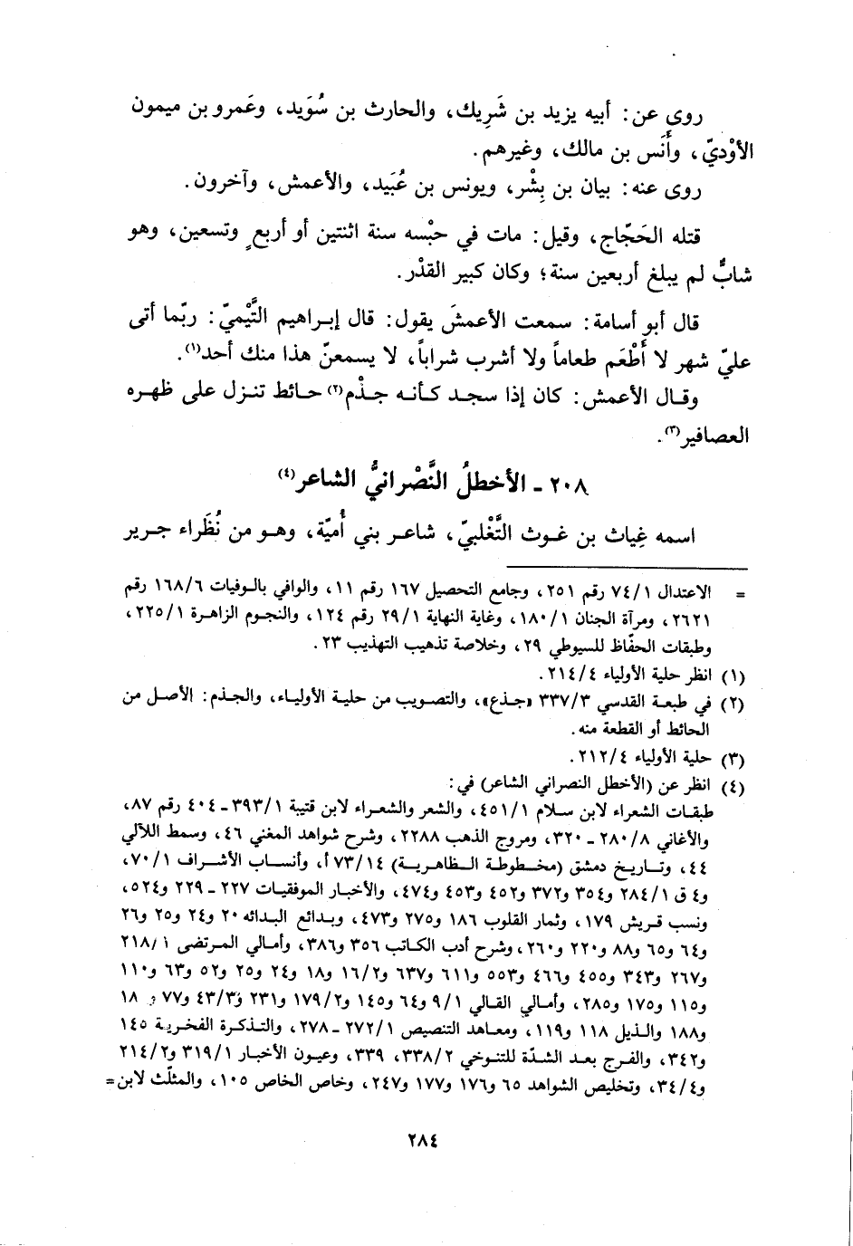 208- الأَخْطَلُ النَّصْرَانِيُّ الشَّاعِرُ [4] اسْمُهُ غِيَاثُ بْنُ غَوْثٍ التَّغْلِبِيُّ، شَاعِرُ بَنِي أُمَيَّةَ، وَهُوَ مِنْ نُظَرَاءِ جَرِيرٍ
