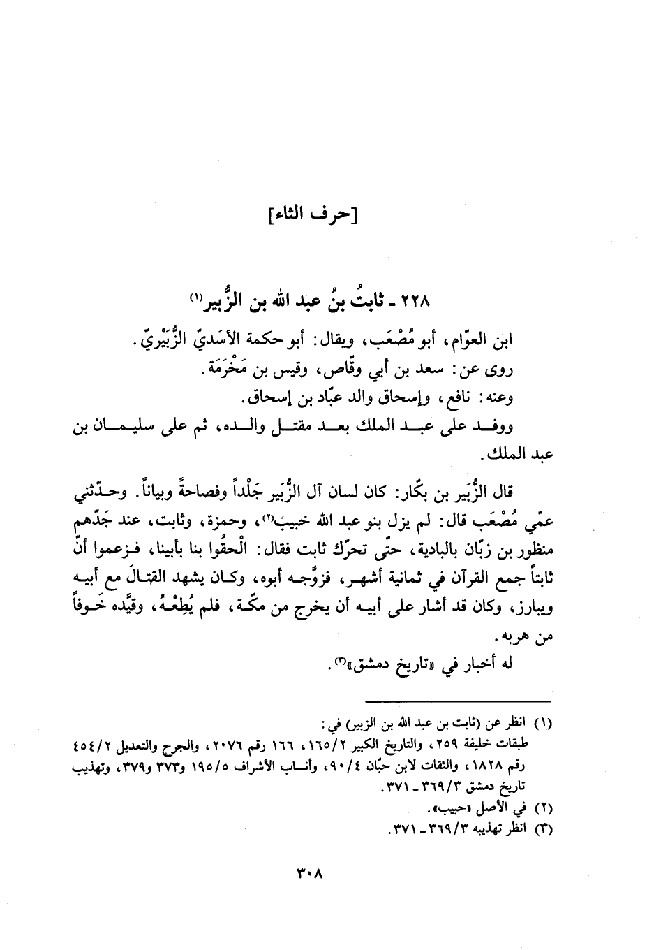 228- ثابت بن عبد الله بن الزبير [1] ابن العوام، أبو مصعب، ويقال: أبو حكمة الأسدي الزبيري.