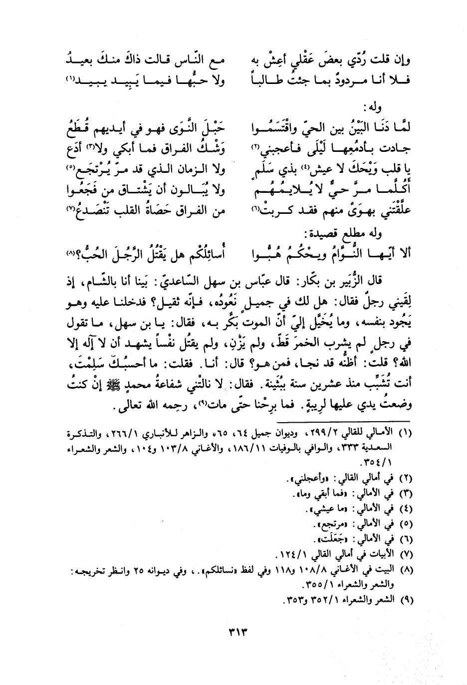 قَالَ الزُّبَيْرُ بْنُ بَكَّارٍ: قَالَ عَبَّاسُ بْنُ سَهْلٍ السَّاعِدِيُّ: بَيْنَا أَنَا بِالشَّامِ، إِذْ لَقِيَنِي رَجُلٌ فَقَالَ: هَلْ لَكَ فِي جَمِيلٍ نَعُودُهُ، فَإِنَّهُ ثَقِيلٌ؟ فَدَخَلْنَا عَلَيْهِ وَهُوَ يَجُودُ بِنَفْسِهِ، وَمَا يُخَيَّلُ إِلَيّ أَنَّ الْمَوْتَ بَكَّرَ بِهِ، فَقَالَ: يَا بْنَ سَهْلٍ، مَا تَقُولُ فِي رَجُلٍ لَمْ يَشْرَبِ الْخَمْرَ قَطُّ، وَلَمْ يَزْنِ، وَلَمْ يَقْتُلْ نَفْسًا يَشْهَدُ أَنَّ لا إِلَهَ إِلا اللَّهَ؟ قُلْتُ: أَظُنُّهُ قَدْ نَجَا، فَمَنْ هُوَ؟ قَالَ: أَنَا. فَقُلْتُ: مَا أَحْسَبُكَ سَلِمْتَ، أَنْتَ تُشَبِّبُ مُنْذُ عِشْرِينَ سَنَةً بِبُثَيْنَةَ. فَقَالَ: لا نَالَتْنِي شَفَاعَةُ مُحَمَّدٍ صَلَّى اللَّهُ عَلَيْهِ وَسَلَّمَ إِنْ كُنْتُ وَضَعْتُ يَدِي عَلَيْهَا لِرِيبَةٍ. فَمَا بَرِحْنا حَتَّى مات [9] ، رحمه الله تعالى.