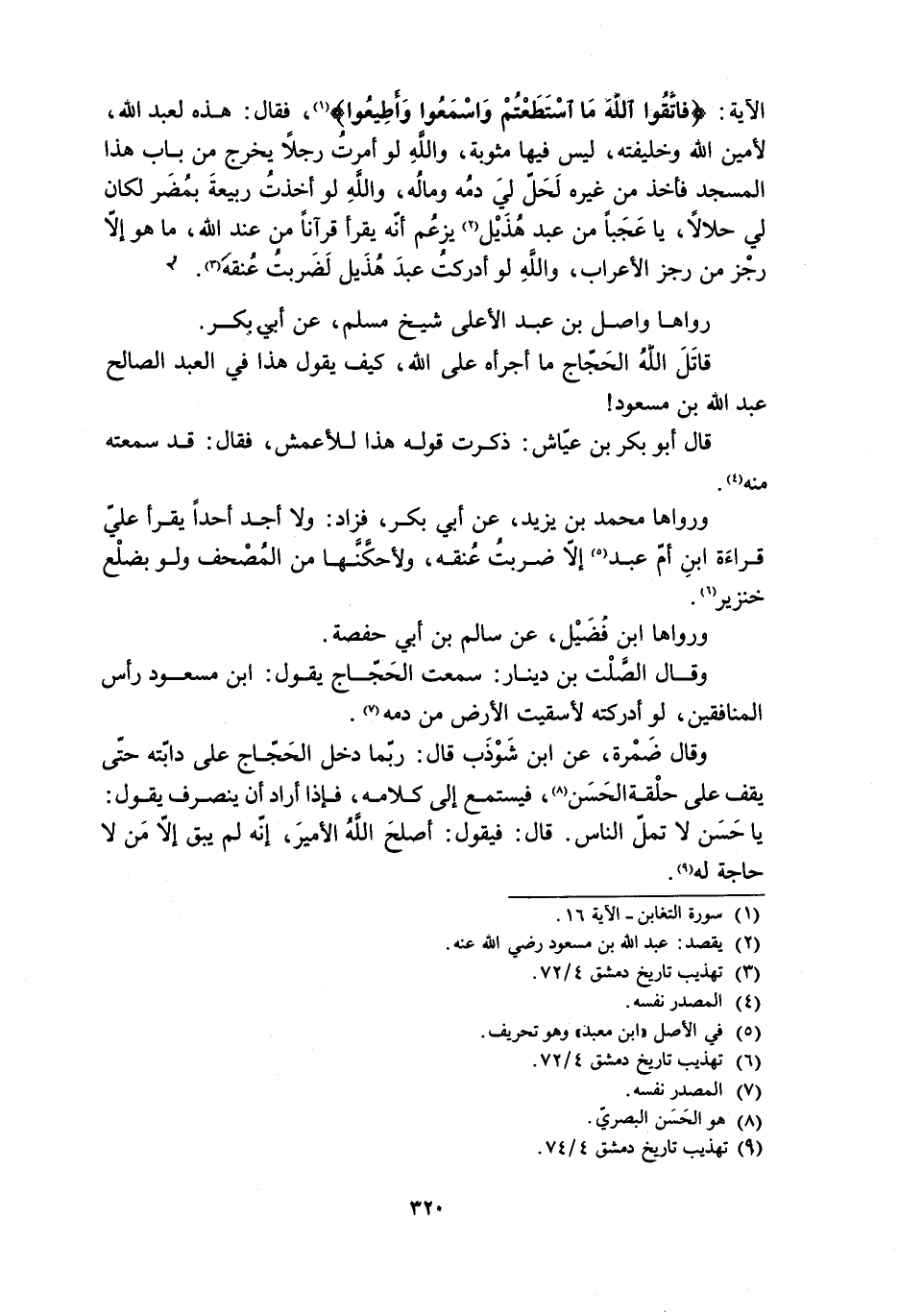 قَاتَلَ اللَّهُ الْحَجَّاجُ مَا أَجْرَأَهُ عَلَى اللَّهِ، كَيْفَ يَقُولُ هَذَا فِي الْعَبْدِ الصَّالِحِ عَبْدِ اللَّهِ بْنِ مَسْعُودٍ! قَالَ أَبُو بَكْرِ بْنُ عَيَّاشٍ: ذَكَرْتُ قَوْلَهُ هَذَا لِلأَعْمَشِ، فَقَالَ: قَدْ سَمِعْتُهُ مِنْهُ [4] .
