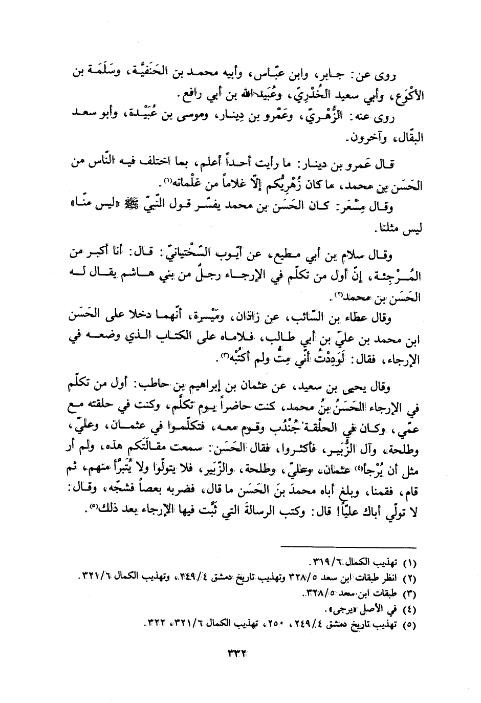 وَقَالَ عَطَاءُ بْنُ السَّائِبِ، عَنْ زَاذَانَ، وَمَيْسَرَةَ، أَنَّهُمَا دَخَلا عَلَى الْحَسَنِ ابن مُحَمَّدِ بْنِ عَلِيِّ بْنِ أَبِي طَالِبٍ، فَلامَاهُ عَلَى الْكِتَابِ الَّذِي وَضَعَهُ فِي الإِرْجَاءِ، فَقَالَ: لَوَدِدْتُ أَنِّي مِتُّ وَلَمْ أَكْتُبْهُ [3] .