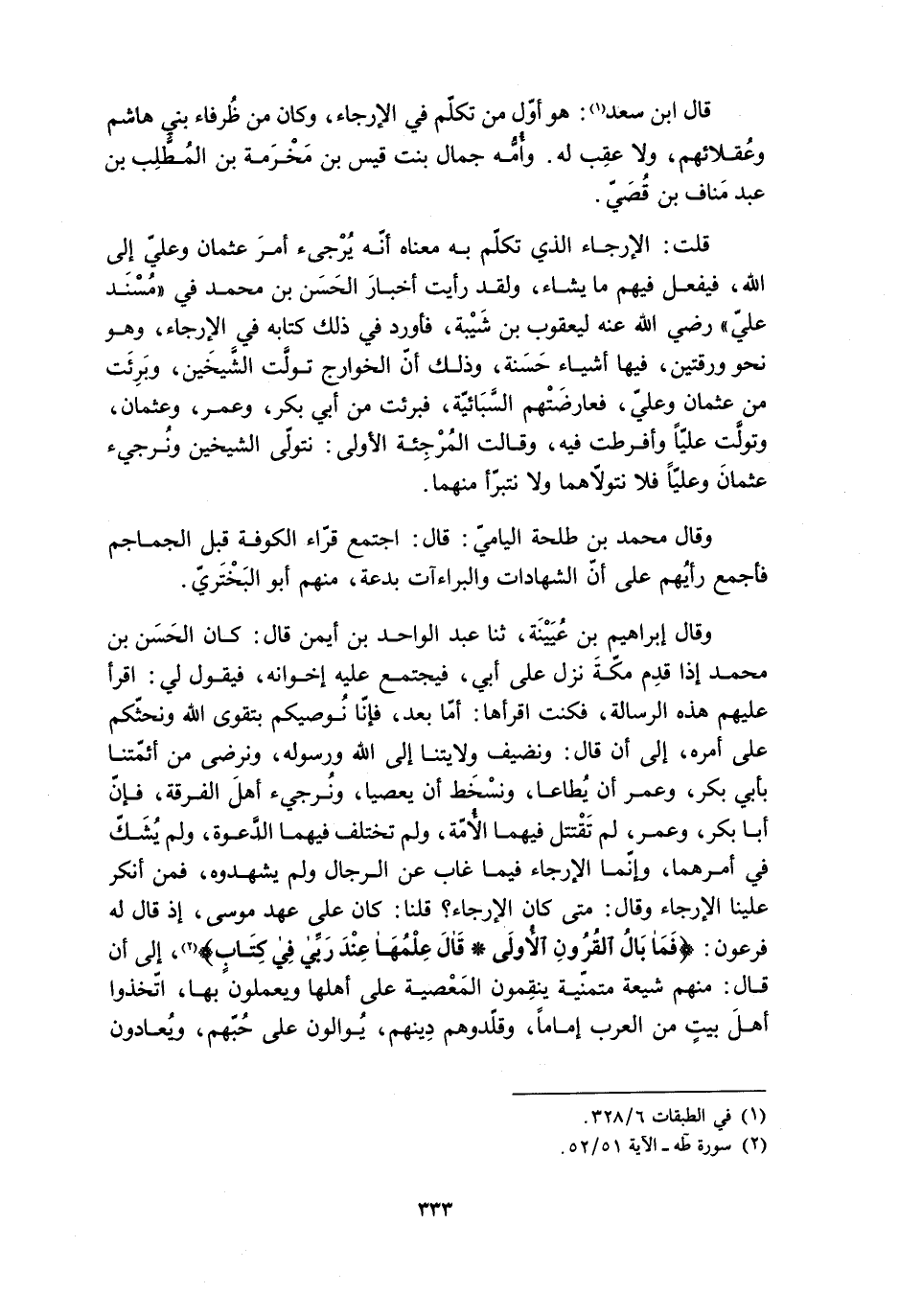 قُلْتُ: الْإِرْجَاءُ الَّذِي تَكَلَّمَ بِهِ مَعْنَاهُ أَنَّهُ يُرْجِئُ أَمْرَ عُثْمَانَ وَعَلِيٍّ إِلَى اللَّهِ، فَيَفْعَلُ فِيهِمْ مَا يَشَاءُ، وَلَقَدْ رَأَيْتُ أَخْبَارَ الْحَسَنِ بْنِ مُحَمَّدٍ فِي «مُسْنَدِ عَلِيٍّ» رَضِيَ اللَّهُ عَنْهُ لِيَعْقُوبَ بْنِ شَيْبَةَ، فَأَوْرَدَ فِي ذَلِكَ كِتَابَهُ فِي الإِرْجَاءِ، وَهُوَ نَحْوَ وَرَقَتَيْنِ، فِيهَا أَشْيَاءُ حَسَنَةٌ، وَذَلِكَ أَنَّ الْخَوَارِجَ تَوَلَّتِ الشَّيْخَيْنِ، وَبَرِئَتْ مِنْ عُثْمَانَ وَعَلِيٍّ، فَعَارَضَتْهُمُ السَّبَائِيَّةُ، فَبَرِئَتْ مِنْ أَبِي بَكْرٍ، وَعُمَرَ، وَعُثْمَانَ، وَتَوَلَّتْ عَلِيًّا وَأَفْرَطَتْ فِيهِ، وَقَالَتِ الْمُرْجِئَةُ الأُولَى: نَتَوَلَّى الشَّيْخَيْنِ وَنُرْجِئُ عُثْمَانَ وَعَلِيًّا فَلا نَتَوَلاهُمَا وَلا نَتَبَرَّأُ مِنْهُمَا.