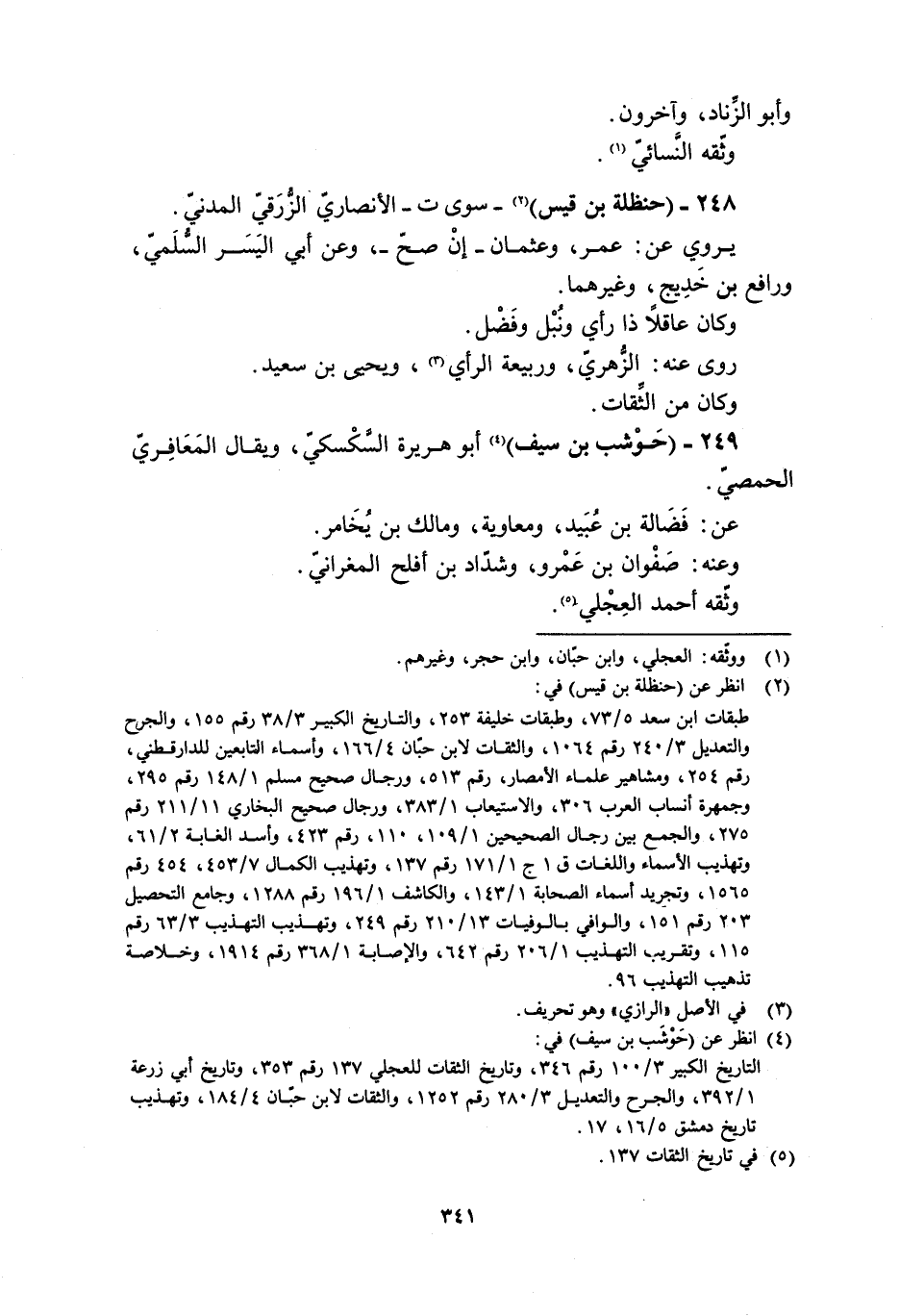 التاريخ الكبير 3/ 100 رقم 346، وتاريخ الثقات للعجلي 137 رقم 353، وتاريخ أبي زرعة 1/ 392، والجرح والتعديل 3/ 280 رقم 1252، والثقات لابن حبّان 4/ 184، وتهذيب تاريخ دمشق 5/ 16، 17.