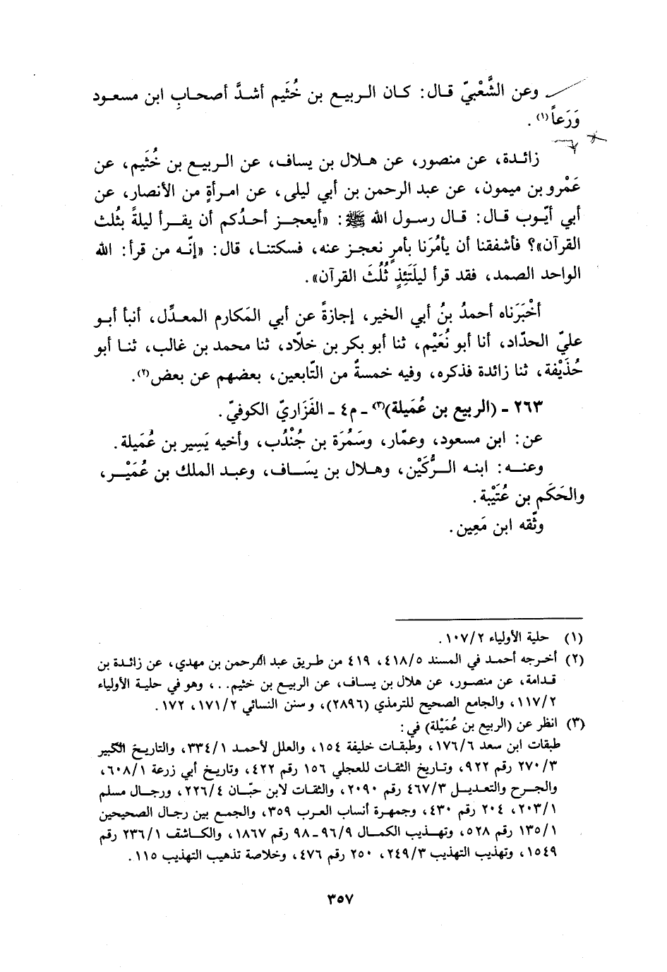 [2] أخرجه أحمد في المسند 5/ 418، 419 من طريق عبد الرحمن بن مهدي، عن زائدة بن قدامة، عَنْ مَنْصُورٍ، عَنْ هِلالِ بْنِ يَسَافٍ، عَنِ الربيع بن خثيم..، وهو في حلية الأولياء 2/ 117، والجامع الصحيح للترمذي (2896) ، وسنن النسائي 2/ 171، 172.
