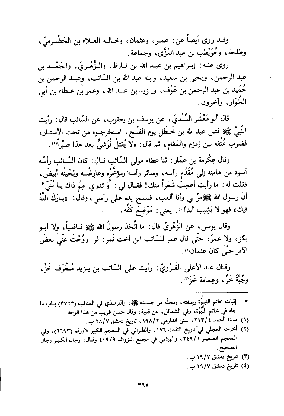 وَقَالَ عَبْدُ الأَعْلَى الْفَرْوِيُّ: رَأَيْتُ عَلَى السَّائِبِ بْنِ يَزِيدَ مِطْرَفَ خَزٍّ، وَجُبَّةَ خَزٍّ، وعمامة خزّ [4] .