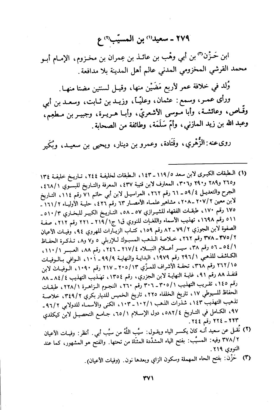 279- سعيد [1] بن المسيّب [2] ع ابن حَزْنِ [3] بْنِ أَبِي وَهْبِ بْنِ عَائِذِ بْنِ عِمْرَانَ بْنِ مَخْزُومٍ، الإِمَامُ أَبُو مُحَمَّدٍ القرشي المخزومي المدني عَالِمُ أَهْلِ الْمَدِينَةِ بِلا مُدَافَعَةٍ.