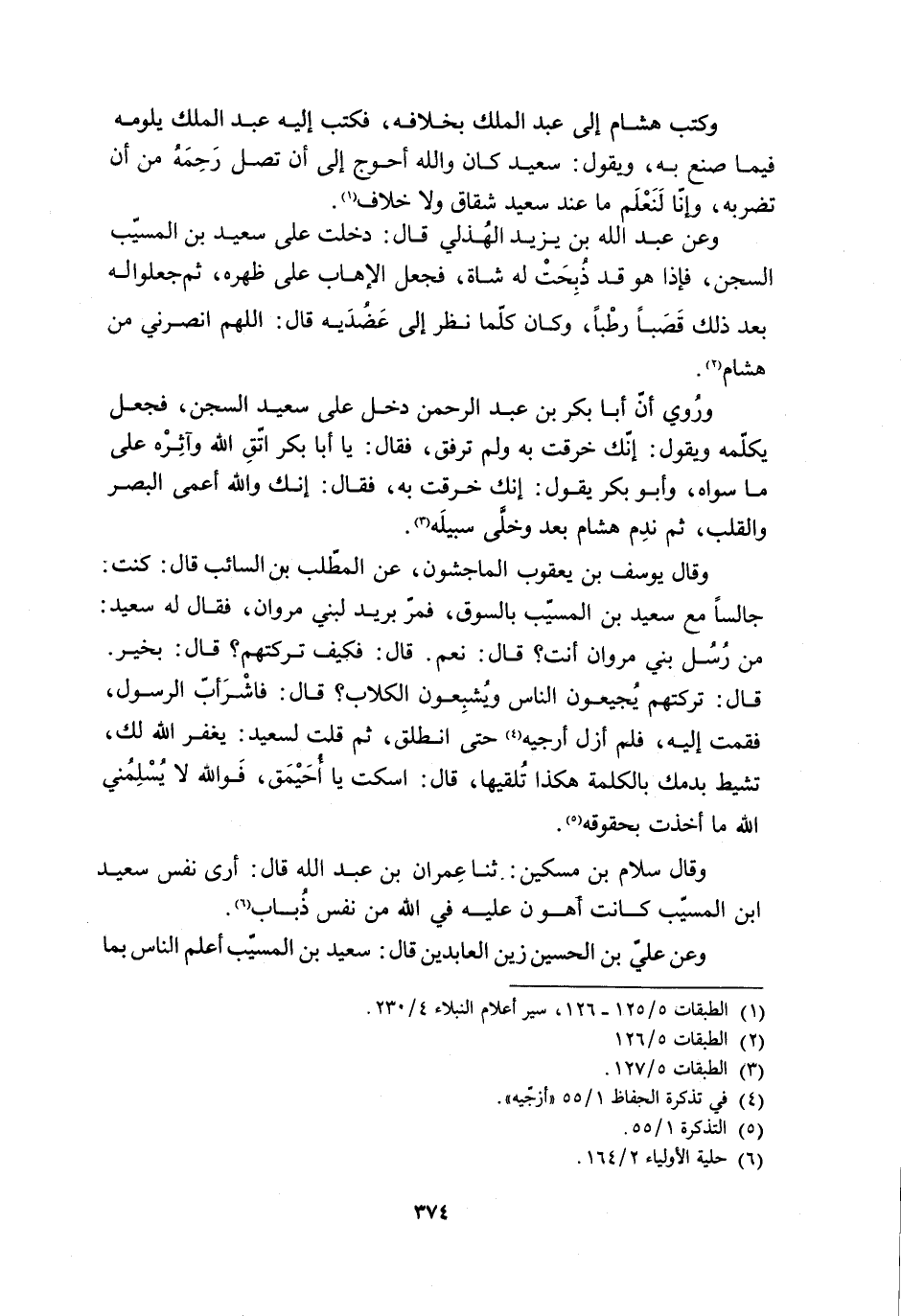 وَعَنْ عَبْدِ اللَّهِ بْنِ يَزِيدَ الْهُذَلِيِّ قَالَ: دَخَلْتُ عَلَى سَعِيدِ بْنِ الْمُسَيِّبِ السِّجْنَ، فَإِذَا هُوَ قَدْ ذُبِحَتْ لَهُ شَاةٌ، فَجَعَلَ الْإِهَابَ عَلَى ظَهْرِهِ، ثُمَّ جَعَلُوا لَهُ بَعْدَ ذَلِكَ قَصَبًا رَطْبًا، وَكَانَ كُلَّمَا نَظَرَ إِلَى عَضُدَيْهِ قَالَ: اللَّهمّ انْصُرْنِي مِنْ هِشَامٍ [2] .