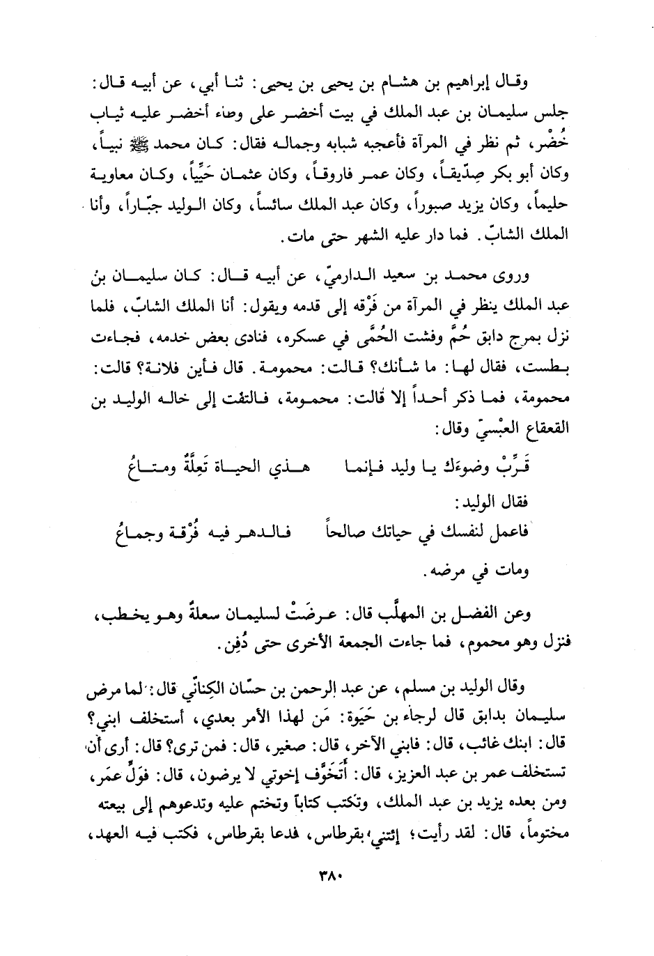 قَالَ: ابْنُكَ غَائِبٌ، قَالَ: فَابْنِي الآخَرُ، قَالَ: صَغِيرٌ، قَالَ: فَمَنْ تَرَى؟ قَالَ: أَرَى أَنْ تَسْتَخْلِفَ عُمَرَ بْنَ عَبْدِ الْعَزِيزِ، قَالَ: أَتَخَوَّفُ إِخْوَتِي لا يَرْضَوْنَ، قَالَ: فَوَلِّ عُمَرَ، وَمِنْ بَعْدِهِ يَزِيدُ بْنُ عَبْدِ الْمَلِكِ، وَتَكْتُبُ كِتَابًا وَتَخْتِمُ عَلَيْهِ وَتَدْعُوهُمْ إِلَى بَيْعَتِهِ مَخْتُومًا، قال: لقد رأيت، ائتني بقرطاس، فدعا بقرطاس، فَكَتَبَ فِيهِ الْعَهْدَ،