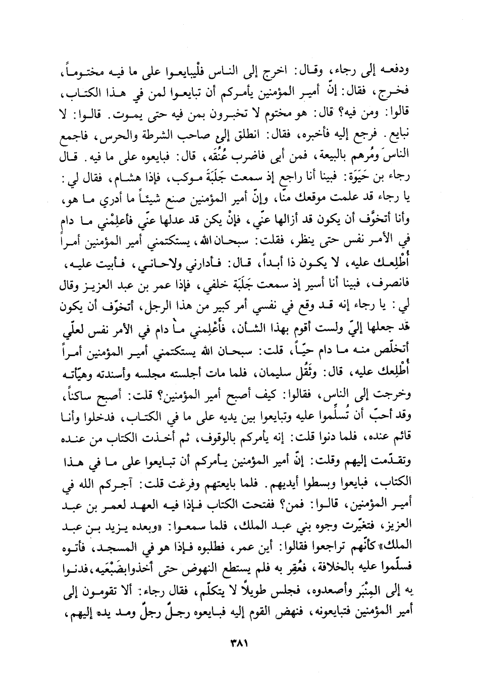 يَا رَجَاءُ قَدْ عَلِمْتُ مَوْقِعَكَ مِنَّا، وَإِنَّ أَمِيرَ الْمُؤْمِنِينَ صَنَعَ شَيْئًا مَا أَدْرِي مَا هُوَ، وَأَنَا أَتَخَوَّفُ أَنْ يَكُونَ قَدْ أَزَالَهَا عَنِّي، فَإِنْ يَكُنْ قَدْ عَدَلَهَا عَنِّي فَأَعْلِمْنِي مَا دَامَ فِي الأَمْرِ نَفْسٌ حَتَّى يَنْظُرَ، فَقُلْتُ: سبحان الله، يستكتمني أمير المؤمنين أمرا أطلعك عليه، لا يكون ذا أبدا، قال: فأدارني وَلاحَانِي، فَأَبَيْتُ عَلَيْهِ، فَانْصَرَفَ، فَبَيْنَا أَنَا أَسِيرُ إِذْ سَمِعْتُ جَلَبَةً خَلْفِي، فَإِذَا عُمَرُ بْنُ عَبْدِ الْعَزِيزِ وَقَالَ لِي: يَا رَجَاءُ إِنَّهُ قَدْ وَقَعَ فِي نَفْسِي أَمْرٌ كَبِيرٌ مِنْ هَذَا الرَّجُلِ، أَتَخَوَّفُ أَنْ يَكُونَ قَدْ جَعَلَهَا إلي ولست أقوم بهذا الشأن، فأعلمني ما دام في الأمر نفس لعلي أتخلص منه مَا دَامَ حَيًّا، قُلْتُ: سُبْحَانَ اللَّهِ يَسْتَكْتِمُنِي أَمِيرُ الْمُؤْمِنِينَ أَمْرًا أُطْلِعَكَ عَلَيْهِ، قَالَ: وَثَقُلَ سُلَيْمَانُ، فَلَمَّا مَاتَ أَجْلَسْتُهُ مَجْلِسَهُ وَأَسْنَدْتُهُ وَهَيَّأْتُهُ وخرجت إلى الناس، فقالوا: كيف أصبح أمير الْمُؤْمِنِينَ؟ قُلْتُ: أَصْبَحَ سَاكِنًا، وَقَدْ أَحَبَّ أَنْ تُسَلِّمُوا عَلَيْهِ وَتُبَايِعُوا بَيْنَ يَدَيْهِ عَلَى مَا فِي الْكِتَابِ، فَدَخَلُوا وَأَنَا قَائِمٌ عِنْدَهُ، فَلَمَّا دَنَوْا قُلْتُ: إِنَّهُ يَأْمُرُكُمْ بِالْوُقُوفِ، ثُمَّ أَخَذْتُ الكتاب من عنده وتقدّمت إليهم وَقُلْتُ: إِنَّ أَمِيرَ الْمُؤْمِنِينَ يَأْمُرُكُمْ أَنْ تُبَايِعُوا عَلَى مَا فِي هَذَا الْكِتَابِ، فَبَايَعُوا وَبَسَطُوا أيديهم. فلما بَايَعْتُهُمْ وَفَرَغْتُ قُلْتُ: آجَرَكُمُ اللَّهُ فِي أَمِيرِ الْمُؤْمِنِينَ، قَالُوا: فَمَنْ؟ فَفَتَحْتُ الْكِتَابَ فَإِذَا فِيهِ الْعَهْدُ لِعُمَرَ بْنِ عَبْدِ الْعَزِيزِ، فَتَغَيَّرَتْ وُجُوهُ بَنِي عَبْدِ الْمَلِكِ، فَلَمَّا سَمِعُوا: «وَبَعْدَهُ يَزِيدُ بْنُ عَبْدِ الْمَلِكِ» كَأَنَّهُمْ تَرَاجَعُوا فَقَالُوا: أَيْنَ عُمَرُ، فَطَلَبُوهُ فَإِذَا هُوَ فِي الْمَسْجِدِ، فَأَتَوْهُ فَسَلَّمُوا عَلَيْهِ بِالْخِلافَةِ، فَعُقِرَ بِهِ فَلَمْ يَسْتَطِعِ النُّهُوضَ حَتَّى أَخَذُوا بِضَبْعَيْهِ، فَدَنَوْا بِهِ إِلَى الْمِنْبَرِ وَأَصْعَدُوهُ، فَجَلَسَ طَوِيلا لا يَتَكَلَّمُ، فَقَالَ رَجَاءٌ: أَلا تَقُومُونَ إِلَى أَمِيرِ الْمُؤْمِنِينَ فَتُبَايِعُونَهُ، فنهض القوم إليه فبايعوه رجل رجل وَمَدَّ يَدَهُ إِلَيْهِمْ،