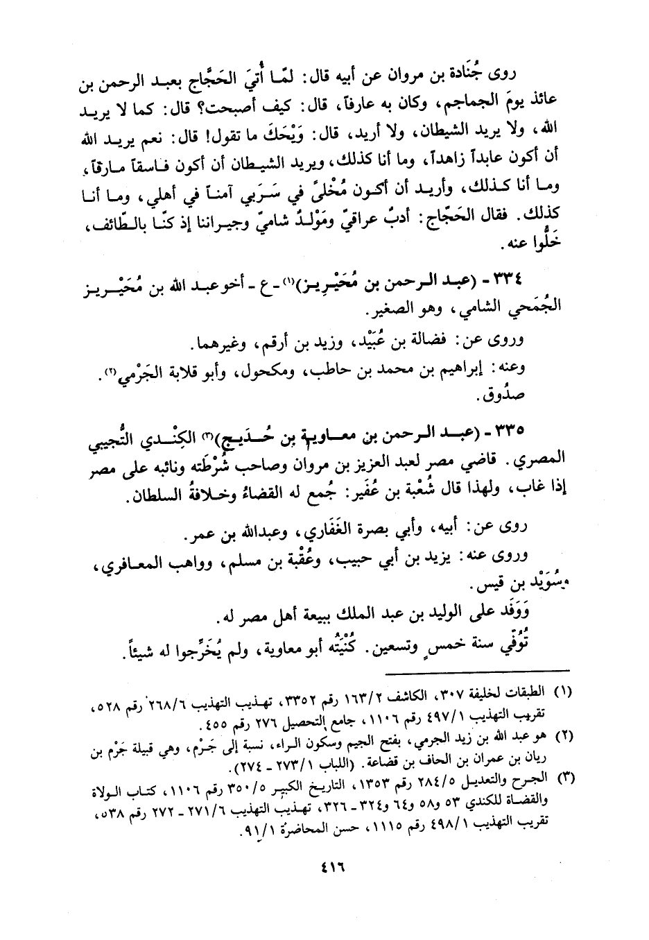 335- (عَبْدُ الرَّحْمَنِ بْنُ مُعَاوِيَةَ بْنِ حُدَيْجٍ) [3] الْكِنْدِيُّ التُّجِيبِيُّ الْمِصْرِيُّ. قَاضِي مِصْرَ لِعَبْدِ الْعَزِيزِ بْنِ مَرْوَانَ وَصَاحِبُ شُرْطَتِهِ وَنَائِبِهِ عَلَى مصر إذا غاب، ولهذا قَالَ شُعْبَةُ بْنُ عُفَيْرٍ: جُمِعَ لَهُ الْقَضَاءُ وَخِلافَةُ السُّلْطَانِ.
