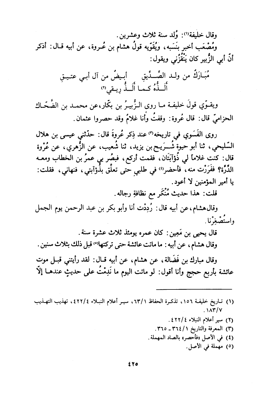 أَلَذُّهُ كَمَا أَلَذُّ رِيقِي [2] وَيُقَوِّي قَوْلَ خَلِيفَةَ مَا رَوَى الزُّبَيْرُ بْنُ بَكَّارٍ، عَنْ مُحَمَّدِ بْنِ الضَّحَّاكِ الْحِزَامِيِّ قَالَ: قَالَ عُرْوَةُ: وَقَفْتُ وَأَنَا غُلامٌ وَقَدْ حَصَرُوا عُثْمَانَ.