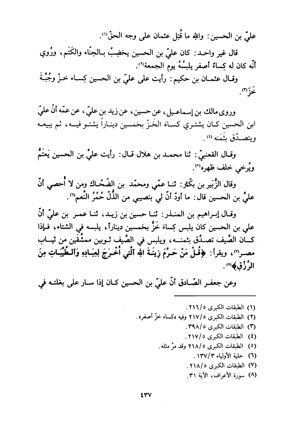 وَقَالَ الْقَعْنَبِيُّ: ثنا مُحَمَّدُ بْنُ هِلَالٍ قَالَ: رَأَيْتُ عَلَى بْنَ الْحُسَيْنِ يَعْتَمُّ وَيُرْخِي خَلْفَ ظَهْرِهِ [5] . وَقَالَ الزُّبَيْرُ بْنُ بَكَّارٍ: ثنا عَمِّي وَمُحَمَّدُ بْنُ الضَّحَّاكِ وَمَنْ لا أُحْصِي أَنَّ عَلِيَّ بْنَ الْحُسَيْنِ قَالَ: مَا أَوَدُّ أَنَّ لِي بِنَصِيبِي مِنَ الذُّلِّ حُمُرَ النَّعَمِ [6] . وَقَالَ إِبْرَاهِيمُ بْنُ الْمُنْذِرِ: ثنا حُسَيْنُ بْنُ زَيْدٍ، ثنا عُمَرُ بْنُ عَلِيٍّ أَنَّ عَلِيَّ بْنَ الْحُسَيْنِ كَانَ يَلْبَسُ كِسَاءَ خَزٍّ بِخَمْسِينَ دِينَارًا، يَلْبَسُهُ فِي الشِّتَاءِ، فَإِذَا كَانَ الصَّيْفُ تَصَدَّقَ بِثَمَنِهِ، وَيَلْبَسُ فِي الصَّيْفِ ثَوْبَيْنِ مُمَشَّقَيْنِ مِنْ ثِيَابِ مِصْرَ [7] ، وَيَقْرَأُ: قُلْ مَنْ حَرَّمَ زِينَةَ اللَّهِ الَّتِي أَخْرَجَ لِعِبادِهِ وَالطَّيِّباتِ من الرِّزْقِ 7: 32 [8] . وَعَنْ جَعْفَرٍ الصَّادِقِ أَنَّ عَلِيَّ بْنَ الْحُسَيْنِ كان إذا سار على بغلته في