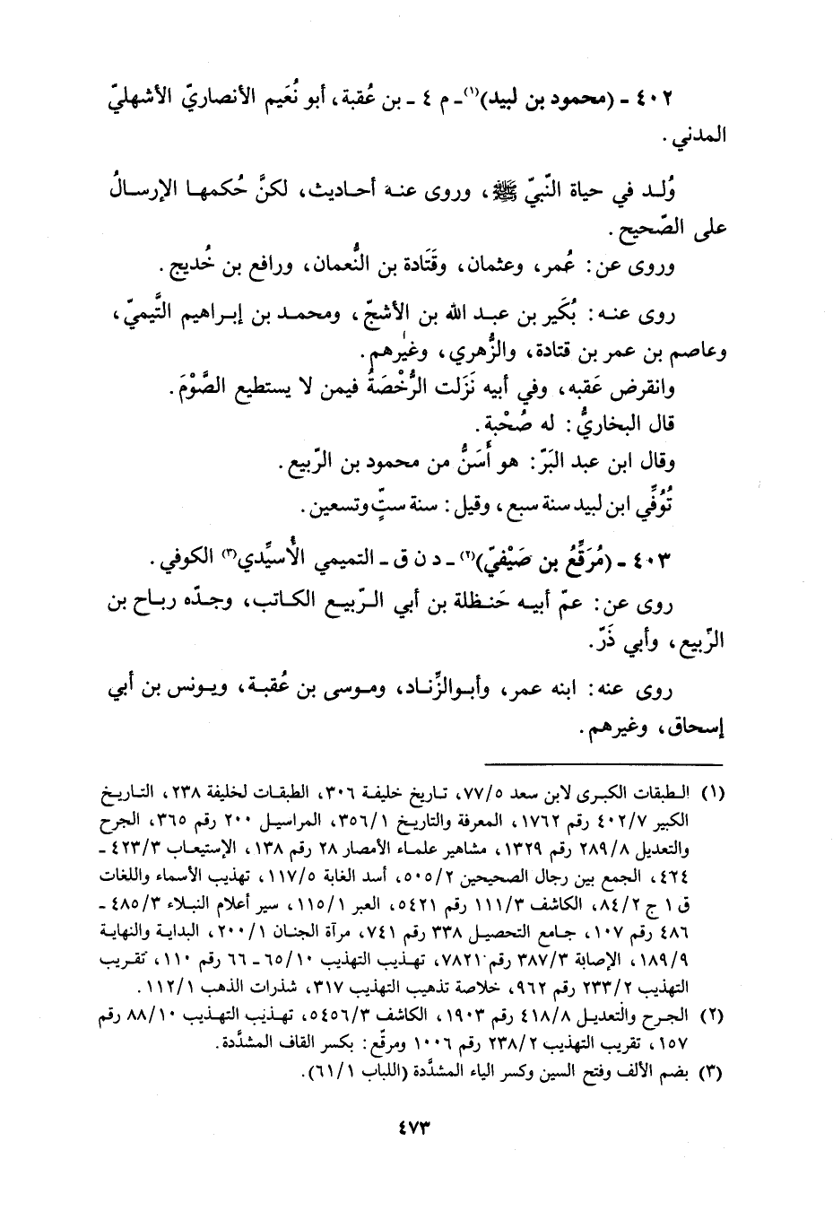 402- (محمود بن لبيد) [1]- م 4- بْنِ عُقْبَةَ، أَبُو نُعَيْمٍ الأَنْصَارِيُّ الأَشْهَلِيُّ الْمَدَنِيُّ.