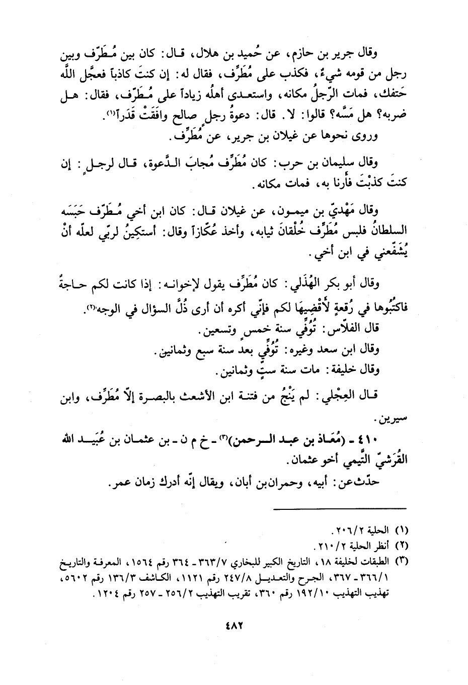 وَقَالَ جَرِيرُ بْنُ حَازِمٍ، عَنْ حُمَيْدِ بْنِ هِلالٍ، قَالَ: كَانَ بَيْنَ مُطَرِّفٍ وَبَيْنَ رَجُلٍ مِنْ قَوْمِهِ شَيْءٌ، فَكَذِبَ عَلَى مُطَرِّفٍ، فَقَالَ لَهُ: إِنْ كُنْتَ كَاذِبًا فَعَجَّلَ اللَّهُ حَتْفَكَ، فَمَاتَ الرَّجُلُ مَكَانَهُ، وَاسْتَعْدَى أَهْلُهُ زِيَادًا عَلَى مُطَرِّفٍ، فَقَالَ: هَلْ ضَرَبَهُ؟ هَلْ مَسَّهُ؟ قَالُوا: لا. قَالَ: دَعْوَةُ رَجُلٍ صَالِحٍ وَافَقَتْ قَدَرًا [1] .