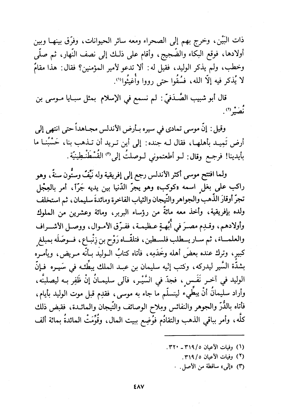 وَلَمَّا افْتَتَحَ مُوسَى أَكْثَرَ الأَنْدَلُسِ رَجَعَ إِلَى إِفْرِيقِيَّةَ وَلَهُ نَيِّفٌ وَسِتُّونَ سَنَةً، وَهُوَ رَاكِبٌ عَلَى بَغْلٍ اسْمُهُ «كَوْكَبٌ» وَهُوَ يَجُرُّ الدُّنْيَا بَيْنَ يَدَيْهِ جَرًّا، أَمَرَ بِالْعِجْلِ تَجُرُّ أَوْقَارَ الذَّهَبِ وَالْجَوَاهِرِ وَالتِّيجَانِ وَالثِّيَابِ الْفَاخِرَةِ وَمَائِدَةِ سُلَيْمَانَ، ثُمَّ اسْتَخْلَفَ وَلَدَهُ بِإِفْرِيقِيَّةَ، وَأَخَذَ مَعَهُ مِائَةً مِنْ رُؤَسَاءِ الْبَرْبَرِ، وَمِائَةً وَعِشْرِينَ مِنَ الْمُلُوكِ وَأَوْلادِهِمْ، وَقَدِمَ مِصْرَ فِي أُبَّهَةٍ عَظِيمَةٍ، فَفَرَّقَ الأَمْوَالَ، وَوَصَلَ الأَشْرَافَ وَالْعُلَمَاءَ، ثُمَّ سَارَ يَطْلُبُ فِلَسْطِينَ، فَتَلَقَّاهُ رَوْحُ بْنُ زِنْبَاعٍ، فَوَصَلَهُ بِمَبْلَغٍ كَبِيرٍ، وَتَرَكَ عِنْدَهُ بَعْضَ أَهْلِهِ وَخَدَمِهِ، فَأَتَاهُ كِتَابُ الْوَلِيدِ بِأَنَّهُ مَرِيضٌ، وَيَأْمُرُهُ بِشِدَّةِ السَّيْرِ لِيُدْرِكَهُ، وَكَتَبَ إِلَيْهِ سُلَيْمَانُ بْنُ عَبْدِ الْمَلِكِ يُبَطِّئُهُ فِي سَيْرِهِ فَإِنَّ الْوَلِيدَ فِي آخِرِ نَفَسٍ، فَجَدَّ فِي السَّيْرِ، فَآلَى سُلَيْمَانُ إِنْ ظَفِرَ بِهِ لَيَصْلُبَنَّهُ، وَأَرَادَ سُلَيْمَانُ أن يبطّئ ليسلّم مَا جَاءَ بِهِ مُوسَى، فَقَدِمَ قَبْلَ مَوْتِ الوليد بأيام، فأتاه بالدّرّ والجوهر وَالنَّفَائِسِ وَمِلاحِ الْوَصَائِفِ وَالتِّيجَانِ وَالْمَائِدَةِ، فَقَبَضَ ذَلِكَ كلّه، وأمر بباقي الذهب وَالتَّقَادُمِ فَوُضِعَ بِبَيْتِ الْمَالِ، وَقُوِّمَتِ الْمَائِدَةُ بِمِائَةِ ألف