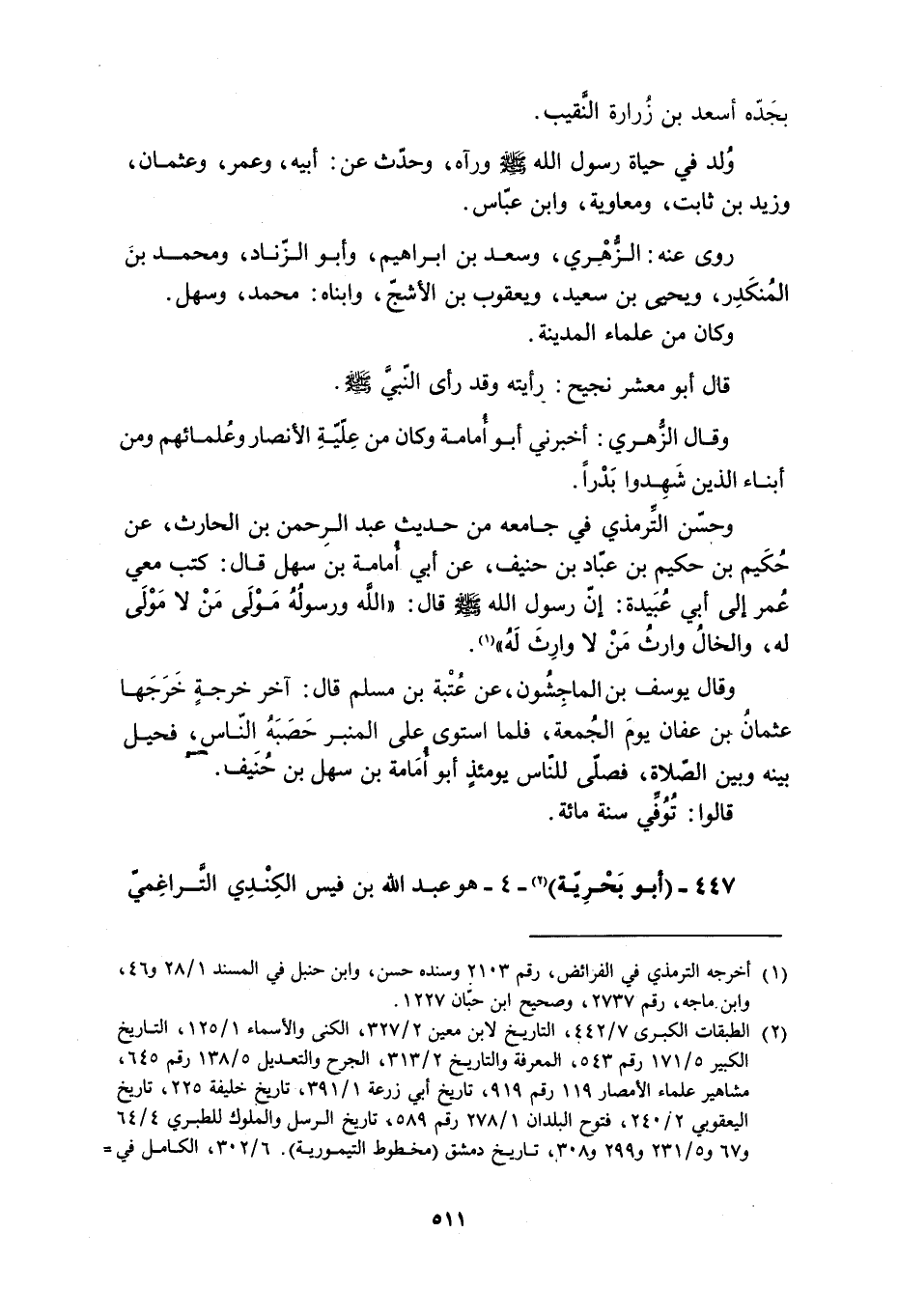 وَحَسَّنَ التِّرْمِذِيُّ فِي جَامِعِهِ مِنْ حَدِيثِ عَبْدِ الرَّحْمَنِ بْنِ الْحَارِثِ، عَنْ حَكِيمُ بْنُ حَكِيمِ بْنِ عَبَّادِ بْنِ حُنَيْفٍ، عَنْ أَبِي أُمَامَةَ بْنِ سَهْلٍ قَالَ: كَتَبَ مَعِي عُمَرُ إِلَى أَبِي عُبَيْدَةَ: إِنَّ رَسُولَ اللَّهِ صَلَّى اللَّهُ عَلَيْهِ وَسَلَّمَ قَالَ: «اللَّهُ وَرَسُولُهُ مَوْلَى مَنْ لا مَوْلَى لَهُ، وَالْخَالُ وَارِثُ مَنْ لا وَارِثَ لَهُ» [1] . وَقَالَ يُوسُفُ بْنُ الْمَاجِشُونِ، عَنْ عُتْبَةَ بْنِ مُسْلِمٍ قَالَ: آخِرُ خَرْجَةٍ خَرَجَهَا عُثْمَانُ بْنُ عَفَّانَ يَوْمَ الْجُمُعَةِ، فَلَمَّا اسْتَوَى عَلَى الْمِنْبَرِ حَصَبَهُ النَّاسُ، فَحِيلَ بَيْنَهُ وَبَيْنَ الصَّلاةِ، فَصَلَّى لِلنَّاسِ يَوْمَئِذٍ أَبُو أُمَامَةَ بْنُ سَهْلِ بْنِ حُنَيْفٍ.