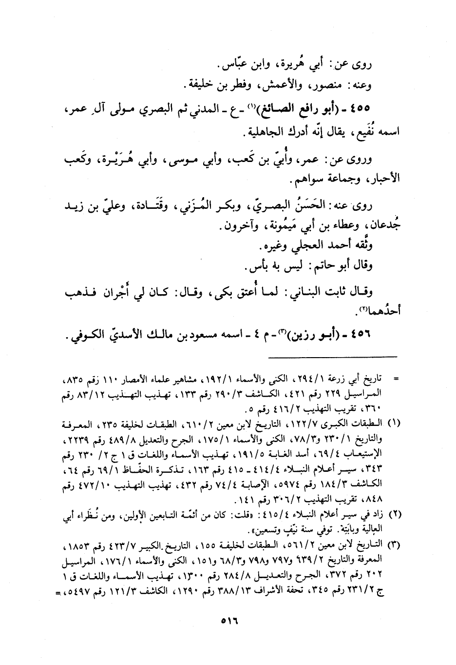 [3] التاريخ لابن معين 2/ 561، الطبقات لخليفة 155، التاريخ الكبير 7/ 423 رقم 1853، المعرفة والتاريخ 2/ 639 و 797 و 798 و 3/ 68 و 151، الكنى والأسماء 1/ 176، المراسيل 202 رقم 372، الجرح والتعديل 8/ 284 رقم 1300، تهذيب الأسماء واللغات ق 1 ج 2/ 231 رقم 345، تحفة الأشراف 13/ 388 رقم 1290، الكاشف 3/ 121 رقم 5497،