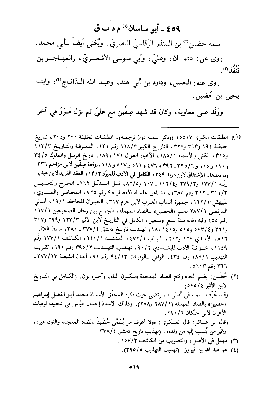 459- أبو ساسان [1] م د ت ق اسْمُهُ حُضَيْنُ [2] بْنُ الْمُنْذِرِ الرَّقَاشِيُّ الْبَصْرِيُّ، وَيُكَنَّى أيضا بأبي محمد.