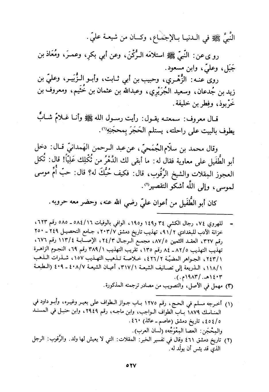 قَالَ مَعْرُوفٌ: سَمِعْتُهُ يَقُولُ: رَأَيْتُ رَسُولَ اللَّهِ صَلَّى اللَّهُ عَلَيْهِ وَسَلَّمَ وَأَنَا غُلامٌ شَابٌّ يَطُوفُ بِالْبَيْتِ عَلَى رَاحِلَتِهِ، يَسْتَلِمُ الْحَجَرَ بِمِحْجَنِهِ [2] . وَقَالَ مُحَمَّدُ بْنُ سَلامٍ الْجُمَحِيُّ، عَنْ عَبْدِ الرَّحْمَنِ الْهَمْدَانِيُّ قَالَ: دَخَلَ أَبُو الطُّفَيْلِ عَلَى مُعَاوِيَةَ فَقَالَ لَهُ: مَا أَبْقَى لَكَ الدَّهْرُ مِنْ ثُكْلِكَ عَلِيًّا! قَالَ: ثُكْلُ الْعَجُوزُ الْمِقْلاتُ وَالشَّيْخُ الرَّقُوبُ، قَالَ: فَكَيْفَ حُبُّكَ لَهُ؟ قَالَ: حُبُّ أُمِّ مُوسَى لِمُوسَى، وَإِلَى اللَّهِ أَشْكُو التَّقْصِيرَ [3] .
