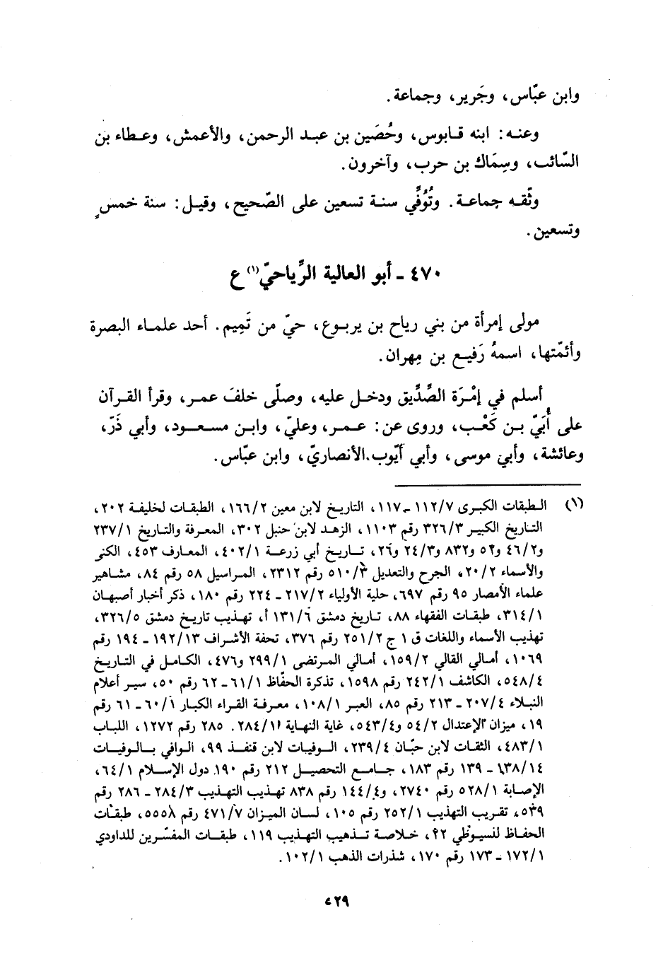 470- أَبُو الْعَالِيَةِ الرِّيَاحِيُّ [1] ع مَوْلَى امرأة مِنْ بَنِي رِيَاحِ بْنِ يَرْبُوعَ، حَيَّ مِنْ تَمِيمٍ. أَحَدَ عُلَمَاءِ الْبَصْرَةِ وَأَئِمَّتِهَا، اسْمُهُ رَفِيعُ بْنُ مِهْرَانَ.