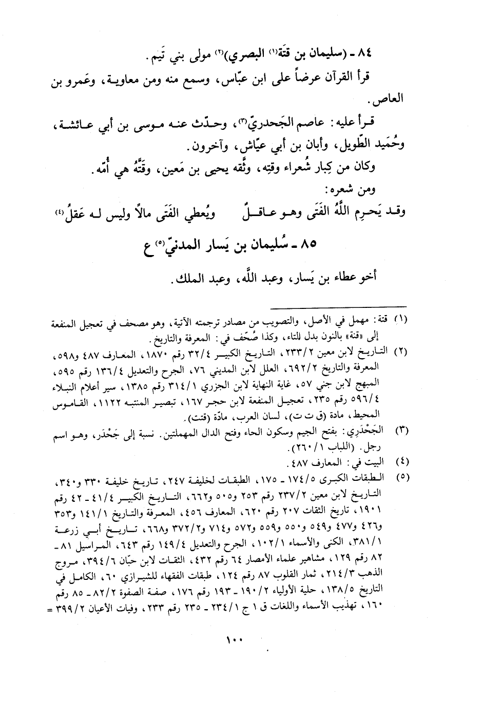[2] التاريخ لابن معين 2/ 233، التاريخ الكبير 4/ 32 رقم 1870، المعارف 487 و 598، المعرفة والتاريخ 2/ 692، العلل لابن المديني 76، الجرح والتعديل 4/ 136 رقم 595، المبهج لابن جني 57، غاية النهاية لابن الجزري 1/ 314 رقم 1385، سير أعلام النبلاء 4/ 596 رقم 235، تعجيل المنفعة لابن حجر 167، تبصير المنتبه 1122، القاموس المحيط، مادة (ق ت ت) ، لسان العرب، مادّة (قتت) .