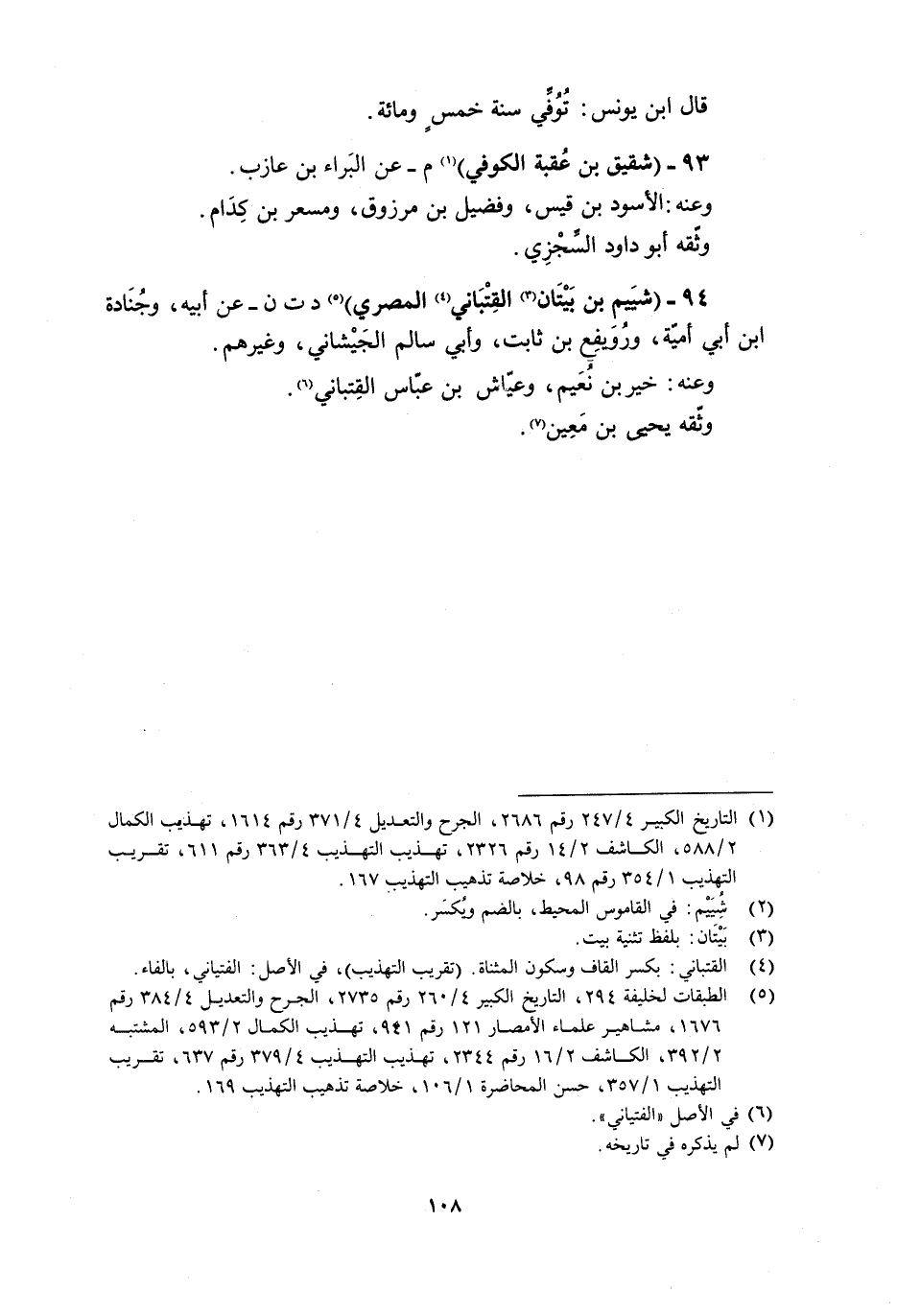 94- (شُيَيْمُ [2] بْنُ بَيْتَانَ [3] الْقِتْبَانِيُّ [4] الْمَصْرِيُّ) [5] د ت ن- عن أبيه، وجنادة ابن أَبِي أُمَيَّةَ، ورويفع بن ثابت، وأبي سالم الجيشاني، وغيرهم.