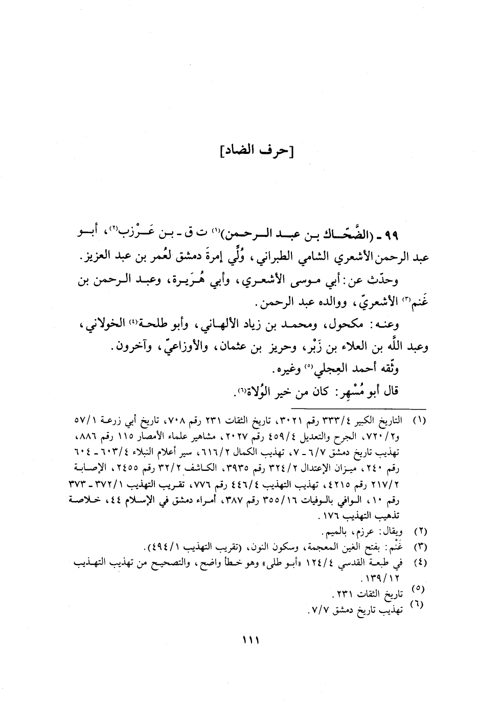 99- (الضّحّاك بن عبد الرحمن) [1] ت ق- بْنِ عَرْزَبٍ [2] ، أَبُو عَبْدِ الرَّحْمَنِ الأَشْعَرِيُّ الشَّامِيُّ الطبراني، وَلِيَ إِمْرَةَ دِمَشْقَ لِعُمَرَ بْنِ عَبْدِ الْعَزِيزِ.