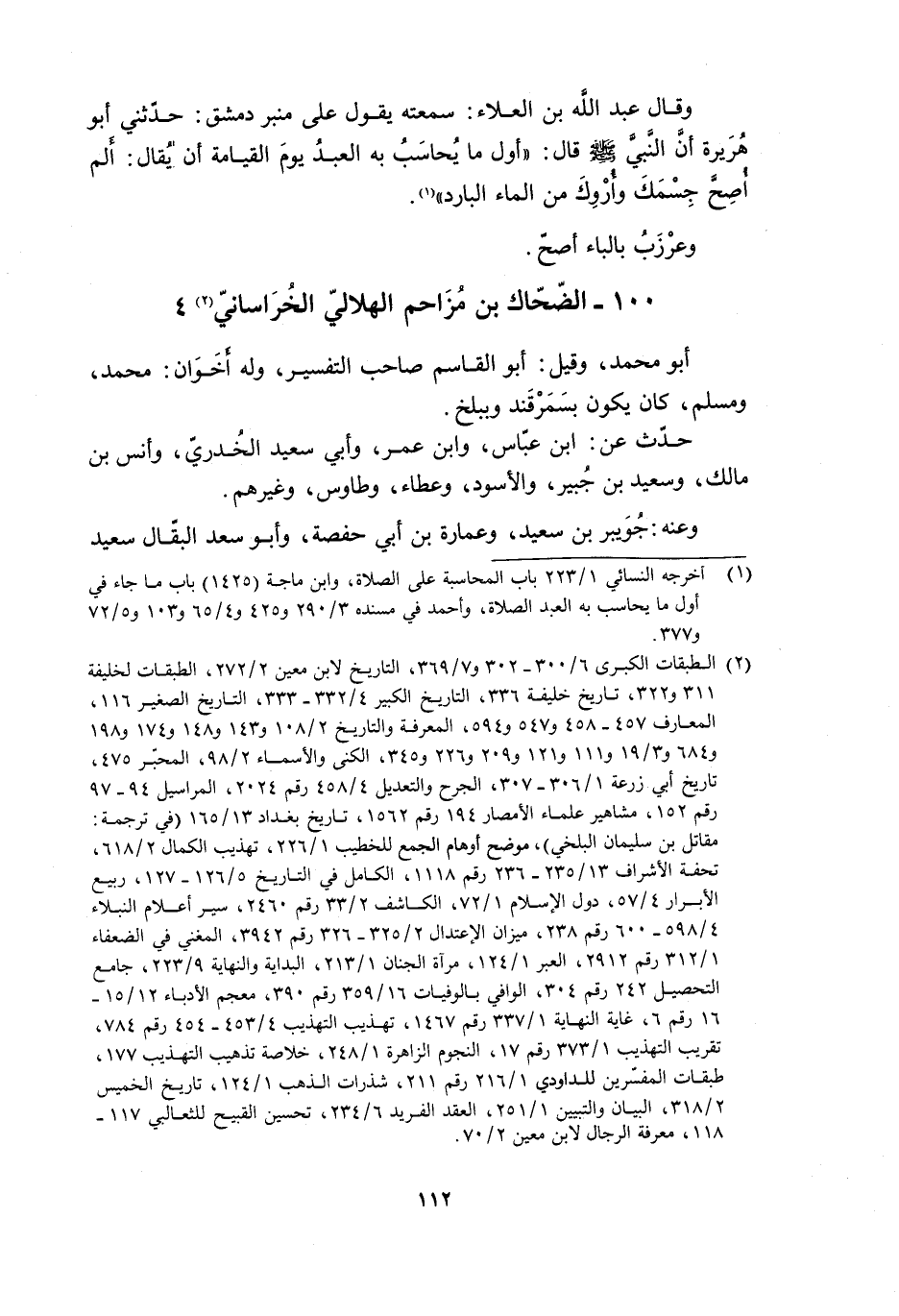 100- الضَّحَّاكُ بْنُ مُزَاحِمٍ الْهِلالِيُّ الْخُرَاسَانِيُّ [2] 4 أَبُو مُحَمَّدٍ، وَقِيلَ: أَبُو الْقَاسِمِ صَاحِبُ التَّفْسِيرِ، وَلَهُ أَخَوَانِ: مُحَمَّدٌ، وَمُسْلِمٌ، كَانَ يكون بسمرقند وببلخ.