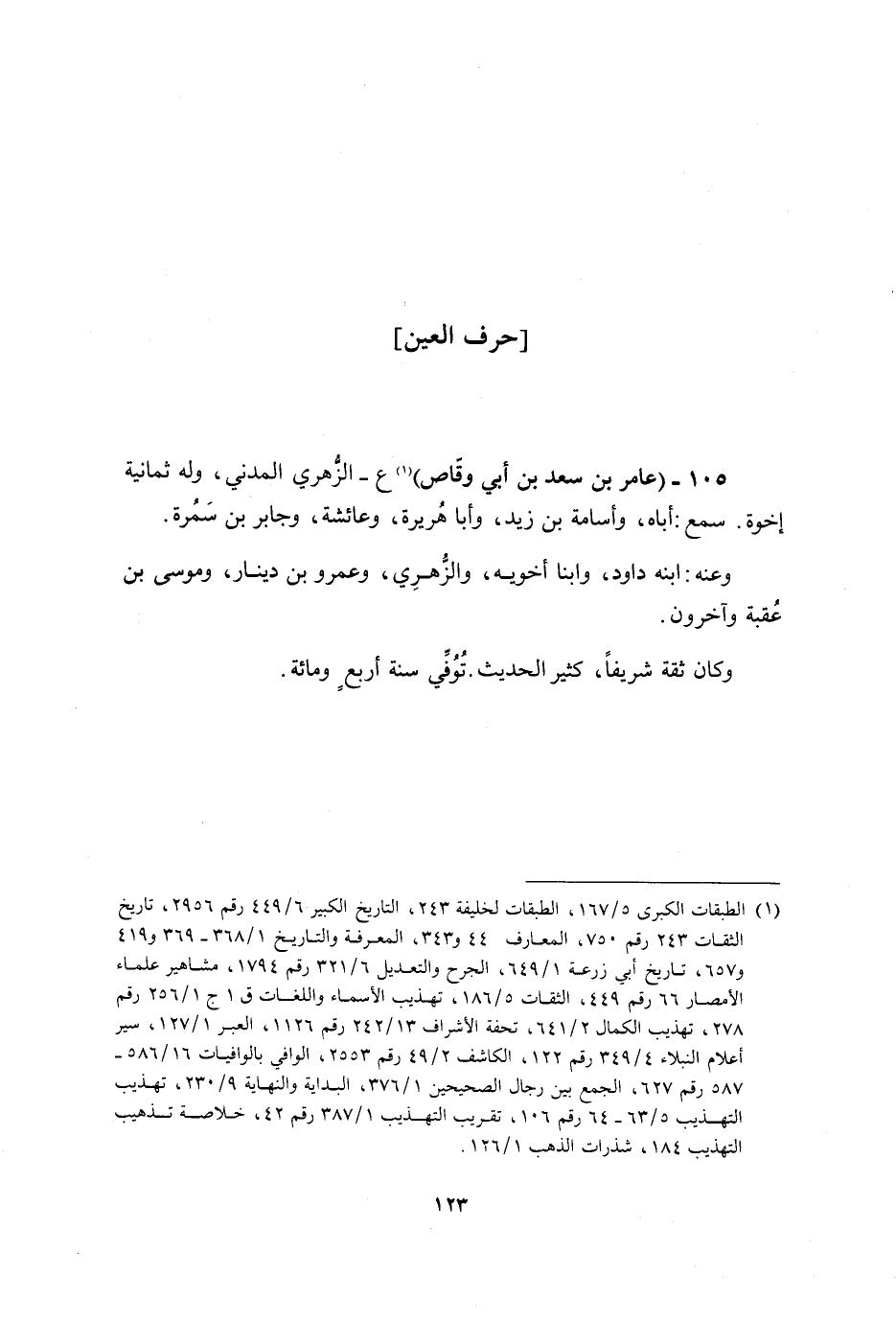 105- (عَامِرُ بْنُ سَعْد بْنِ أَبِي وقّاص) [1] ع- الزّهري المدني، وَلَهُ ثَمَانِيَةُ إِخْوَةٍ. سَمِعَ: أَبَاهُ، وَأُسَامَةَ بْنَ زَيْدٍ، وَأَبَا هُرَيْرَةَ، وَعَائِشَةَ، وَجَابِرَ بْنَ سَمُرَةَ.