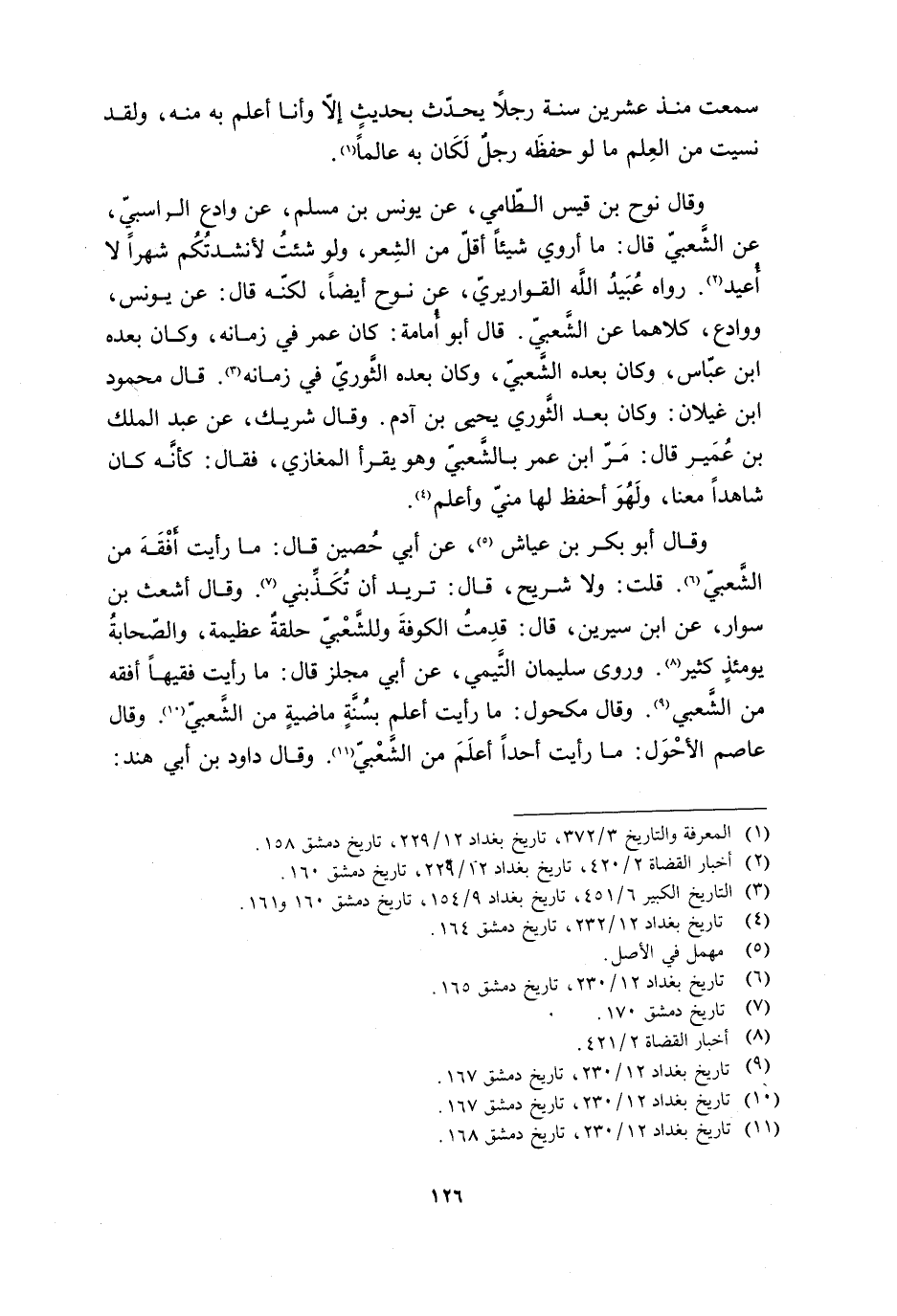 وَقَالَ نُوحُ بْنُ قَيْسٍ الطَّامِيُّ، عَنْ يُونُسَ بْنِ مُسْلِمٍ، عَنْ وَادِعٍ الرَّاسِبِيِّ، عَنِ الشَّعْبِيِّ قَالَ: مَا أَرْوِي شَيْئًا أَقَلَّ مِنَ الشِّعْرِ، وَلَوْ شِئْتُ لأَنْشَدْتُكُمَ شَهْرًا لا أُعِيدُ [2] . رَوَاهُ عُبَيْدُ اللَّهِ الْقَوَارِيرِيُّ، عَنْ نُوحٍ أيضا، لكنّه قَالَ: عَنْ يُونُسَ، وَوَادِعٍ، كِلاهُمَا عَنِ الشَّعْبِيِّ. قَالَ أَبُو أُمَامَةَ: كَانَ عُمَرُ فِي زَمَانِهِ، وكان بعده ابن عبّاس، وكان بعده الشّعبيّ، وكان بعده الثّوريّ في زمانه [3] . قال محمود ابن غِيلانَ: وَكَانَ بَعْدَ الثَّوْرِيِّ يَحْيَى بْنِ آدَمَ. وَقَالَ شَرِيكٌ، عَنْ عَبْدِ الْمَلِكِ بْنِ عُمَيْرٍ قَالَ: مَرَّ ابْنُ عُمَرَ بِالشَّعْبِيِّ وَهُوَ يَقْرَأُ الْمَغَازِي، فَقَالَ: كَأَنَّهُ كَانَ شَاهِدًا مَعَنَا، وَلَهُوَ أَحْفَظُ لَهَا مِنِّي وَأَعْلَمُ [4] .
