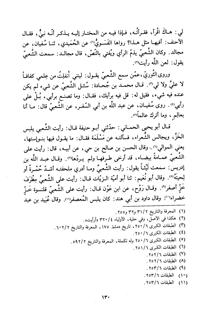 وروى الثّوريّ، عمّن سمع الشَّعْبِيُّ يَقُولُ: لَيْتَنِي أَنْفَلِتُ مِنْ عِلْمِي كَفَافًا لا عَلَيَّ وَلا لِي [3] . قَالَ مُحَمَّدُ بْنُ جُحَادَةَ: سُئِلَ الشَّعْبِيُّ عَنْ شَيْءٍ لَمْ يَكُنْ عِنْدَهُ فِيهِ شَيْءٍ، فَقِيلَ لَهُ: قُلْ فِيهِ بِرَأْيِكَ، فَقَالَ: وَمَا تَصْنَعُ بِرَأْيِي، بَلْ عَلَى رَأْيِي [4] . رَوَى سُفْيَانُ، عَنْ عَبْدِ اللَّهِ بْنِ أَبِي السَّفَرِ، عَنِ الشَّعْبِيِّ قَالَ: مَا أَنَا بِعَالِمٍ، وَمَا أَتْرُكُ عَالِمًا [5] .