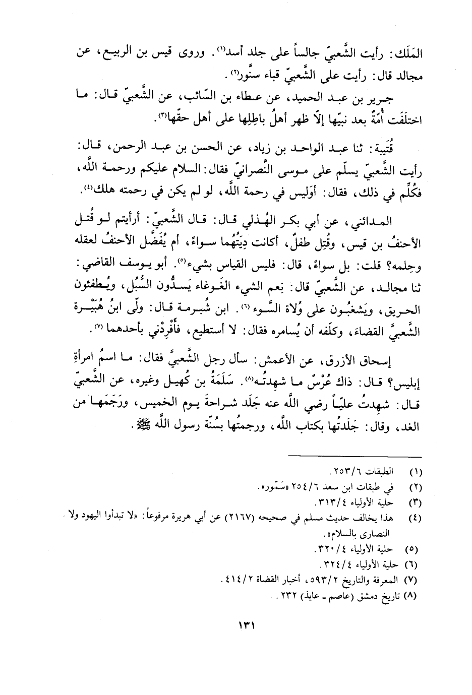 رَأَيْتُ الشَّعْبِيَّ يُسَلِّمُ عَلَى مُوسَى النَّصْرَانِيِّ فَقَالَ: السَّلامُ عَلَيْكُمْ وَرَحْمَةُ اللَّهِ، فَكُلِّمَ فِي ذَلِكَ، فَقَالَ: أَوَلَيْسَ فِي رَحْمَةِ اللَّهِ، لَوْ لَمْ يَكُنْ فِي رَحْمَتِهِ هَلَكَ [4] .