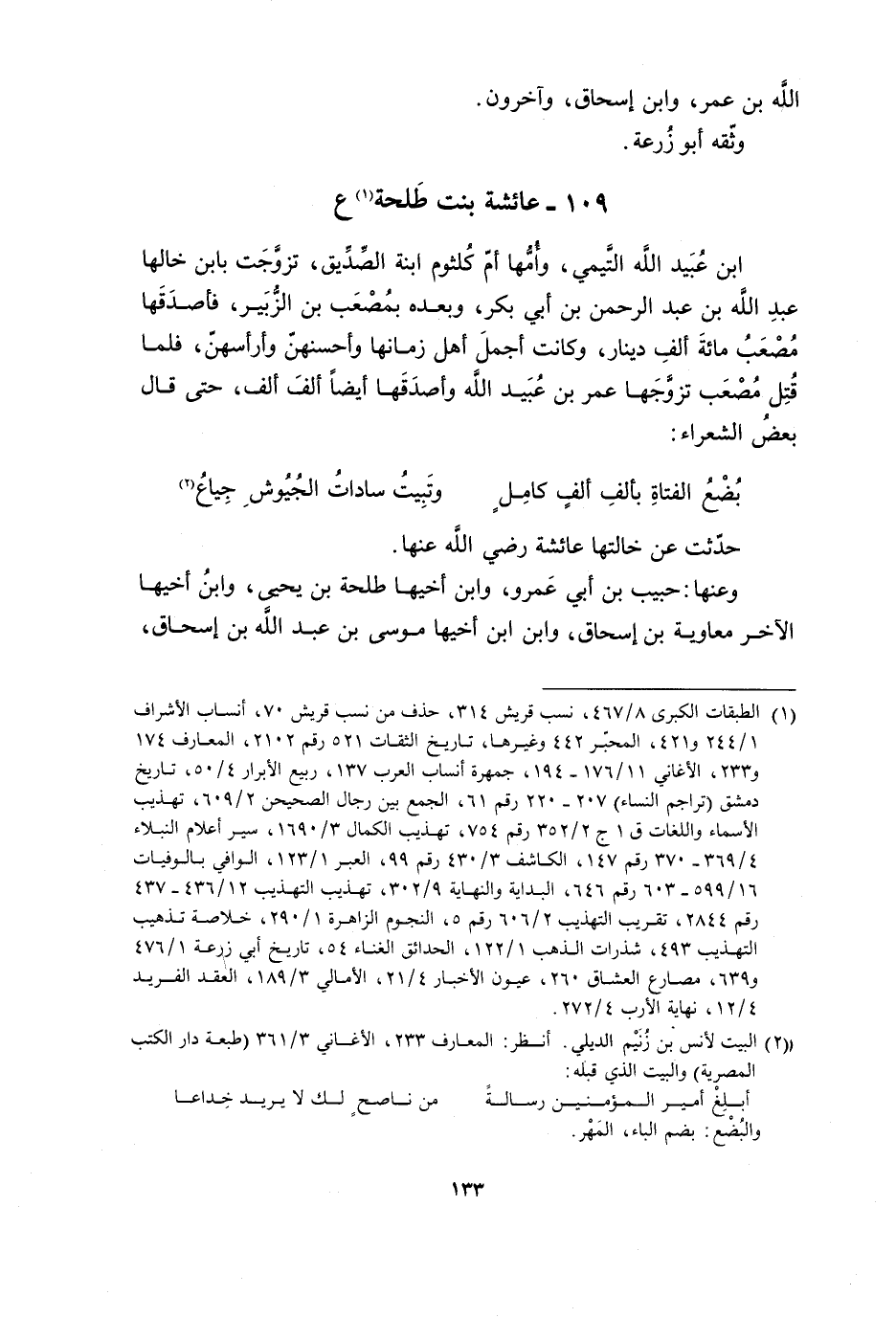 109- عائشة بنت طلحة [1] ع ابن عبيد الله التّيمي، وأمها أُمُّ كُلْثُومٍ ابْنَةُ الصَّدِّيقِ، تَزَوَّجَتْ بِابْنِ خَالِهَا عَبْدِ اللَّهِ بْنِ عَبْدِ الرَّحْمَنِ بْنِ أَبِي بَكْرٍ، وَبَعْدَهُ بِمُصْعَبِ بْنِ الزُّبَيْرِ، فَأَصْدَقَهَا مُصْعَبٌ مِائَةَ أَلْفَ دِينَارٍ، وَكَانَتْ أَجْمَلَ أَهْلِ زَمَانِهَا وَأَحْسَنَهُنَّ وَأَرْأَسَهُنَّ، فَلَمَّا قُتِلَ مُصْعَبٌ تَزَوَّجَهَا عُمَرُ بْنُ عُبَيْدِ اللَّهِ وَأَصْدَقَهَا أَيْضًا أَلْفَ أَلْفٍ، حَتَّى قَالَ بَعْضُ الشُّعَرَاءِ: