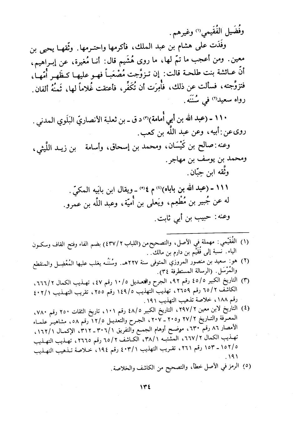 [4] التاريخ لابن معين 2/ 297، التاريخ الكبير 5/ 48 رقم 101، تاريخ الثقات 250 رقم 780، المعرفة والتاريخ 2/ 27 و 205- 207، الجرح والتعديل 5/ 12 رقم 58، مشاهير علماء الأمصار 86 رقم 630، موضح أوهام الجمع والتفريق 1/ 306- 312، الإكمال 1/ 162، تهذيب الكمال 2/ 667، المشتبه 1/ 38، الكاشف 2/ 65 رقم 2665، تهذيب التهذيب 5/ 152- 153 رقم 261، تقريب التهذيب 1/ 403 رقم 194، خلاصة تذهيب التهذيب 191.