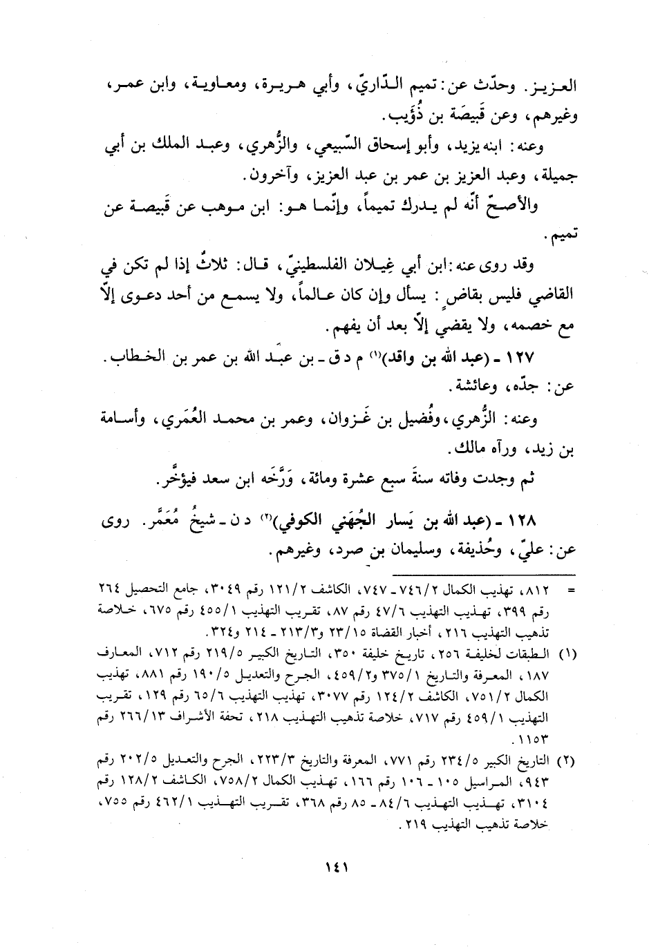 [2] التاريخ الكبير 5/ 234 رقم 771، المعرفة والتاريخ 3/ 223، الجرح والتعديل 5/ 202 رقم 943، المراسيل 105- 106 رقم 166، تهذيب الكمال 2/ 758، الكاشف 2/ 128 رقم 3104، تهذيب التهذيب 6/ 84- 85 رقم 368، تقريب التهذيب 1/ 462 رقم 755، خلاصة تذهيب التهذيب 219.