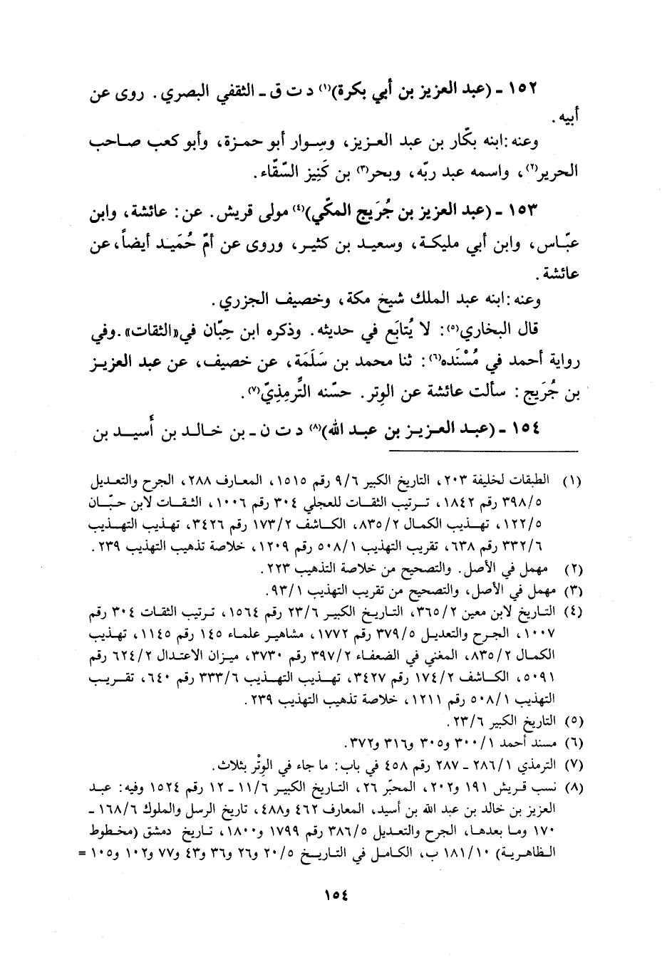[8] نسب قريش 191 و 202، المحبّر 26، التاريخ الكبير 6/ 11- 12 رقم 1524 وفيه: عبد العزيز بن خالد بن عبد الله بن أسيد، المعارف 462 و 488، تاريخ الرسل والملوك 6/ 168- 170 وما بعدها، الجرح والتعديل 5/ 386 رقم 1799 و 1800، تاريخ دمشق (مخطوط الظاهرية) 10/ 181 ب، الكامل في التاريخ 5/ 20 و 26 و 36 و 43 و 77 و 102 و 105